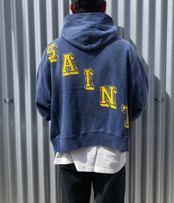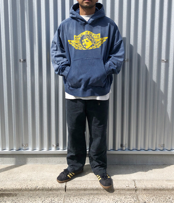 SAINT MICHAELから、HOODIE/ANGEL/NAVYが入荷しました。フェード感に溢れるネイビーカラーのボディにビンテージ感が宿るP/Oフーディー。前後に大きくデザインされたプリントがインパクトあります。バックスタイルでななめにデザインされたSAINTの文字がポイント。