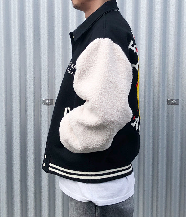 【生産国】本体:WOOL90% NYLON10%、袖:POLYESTER100%、別布:COW LEATHER、裏地:RAYON100%、中綿:POLYESTER100%、リブ:ACRYLIC70% WOOL30%、刺繍:ACRYLIC RAYON CUPRO、ワッペン:WOOL60% RAYON40%
