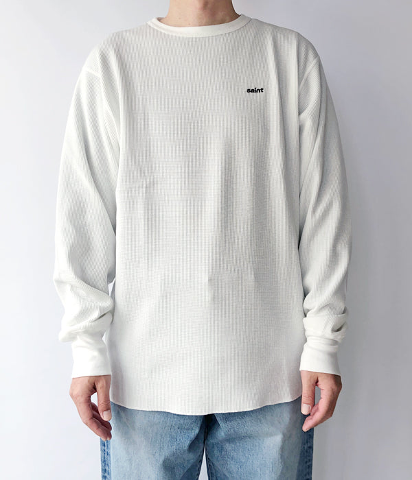 SAINT MICHAELから、LS THARMAL TEE/WHITEが入荷しました。左胸にSAINTのロゴを刺繍でデザインしたワッフルロングスリーブ。断ち切り仕様の裾周りに、袖リブ付きのデザイン。インナーとしても使える柔らかな素材感のシンプルな1着。
