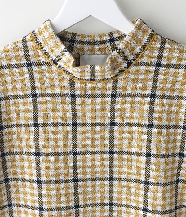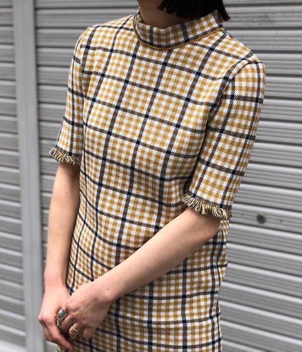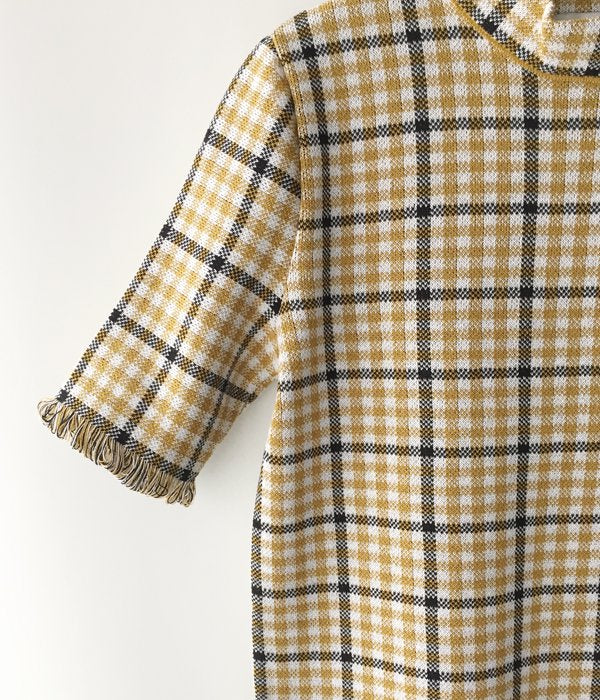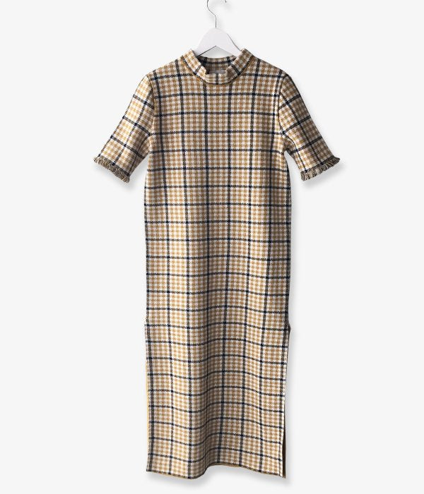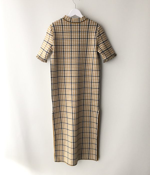しっかりとした編地のチェック柄ワンピース。少し詰まったネックラインや袖口にあしらわれた繊細なフリンジがポイント。両サイドスリット入りでパンツ等とのレイヤードを楽しめます。同素材のビスチェとのコーディネートもおすすめ。