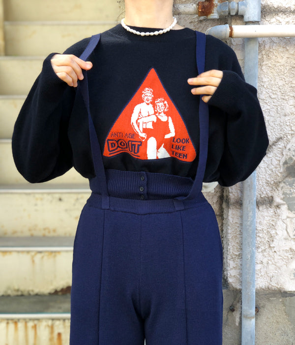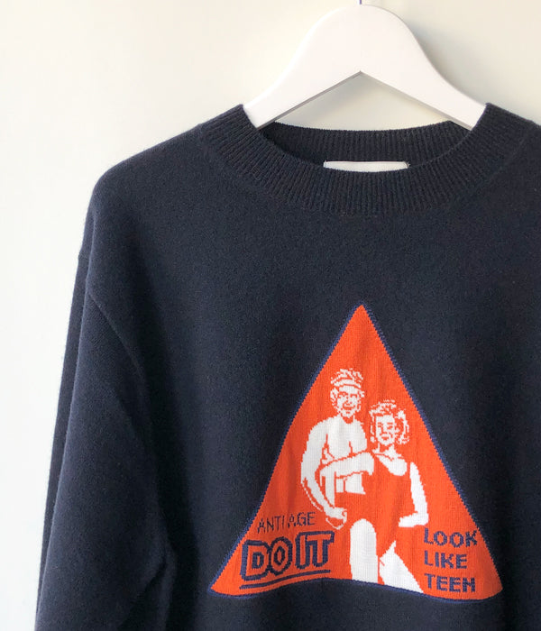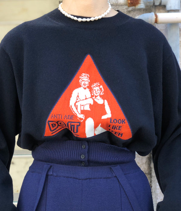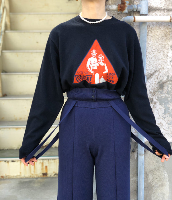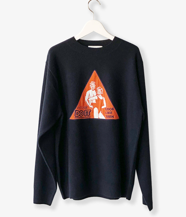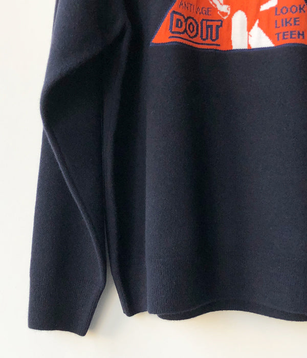 TANから"DO IT" OVERSIZE CREWNECK PULLOVERが入荷しました。インパクトのあるグラフィックをインターシャで編み立てたプルオーバー。デザイナーがある女性をモデルに、彼女のライフスタイルを妄想しながら作ったというユニークな一枚。上質なラムウールを使用し滑らかな肌ざわりで暖かく軽く着心地の良さは抜群です。