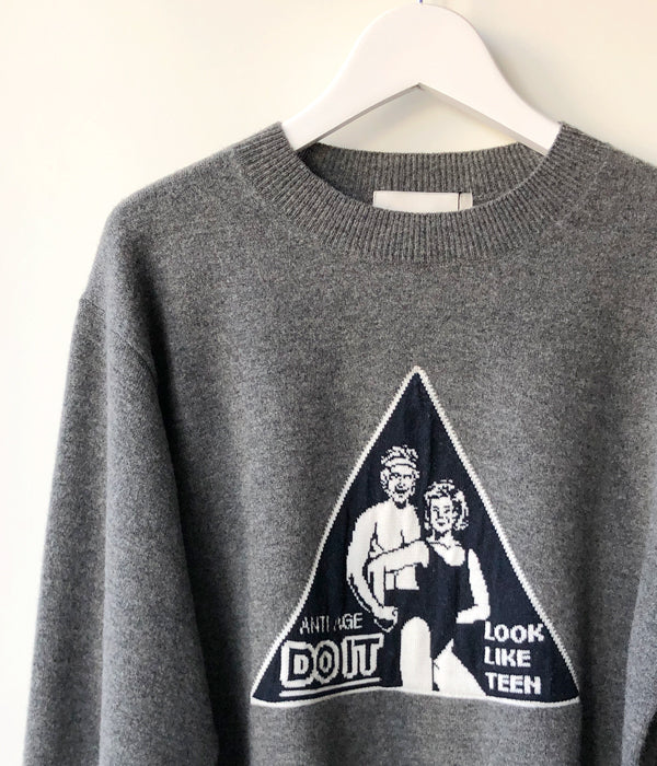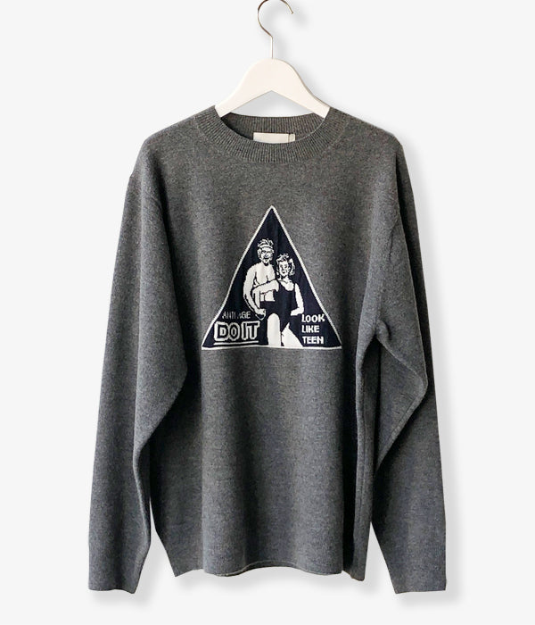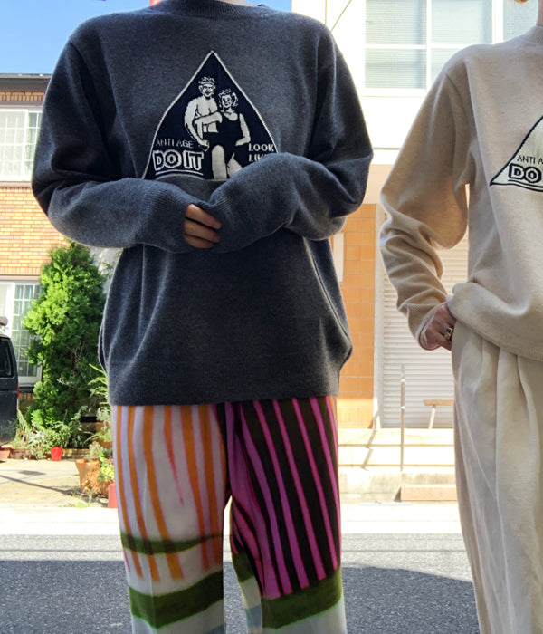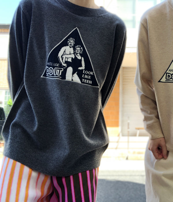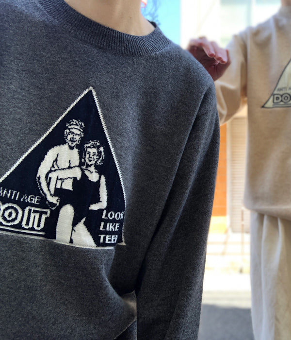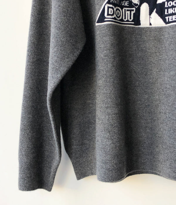 TANから"DO IT" OVERSIZE CREWNECK PULLOVERが入荷しました。インパクトのあるグラフィックをインターシャで編み立てたプルオーバー。デザイナーがある女性をモデルに、彼女のライフスタイルを妄想しながら作ったというユニークな一枚。上質なラムウールを使用し滑らかな肌ざわりで暖かく軽く着心地の良さは抜群です。