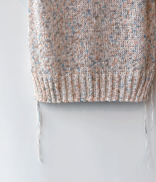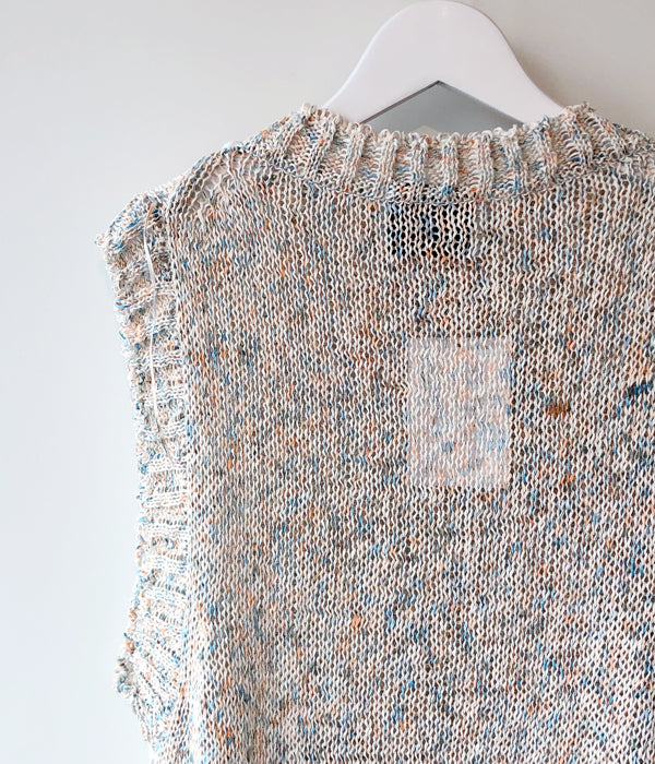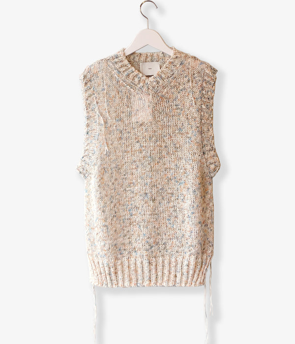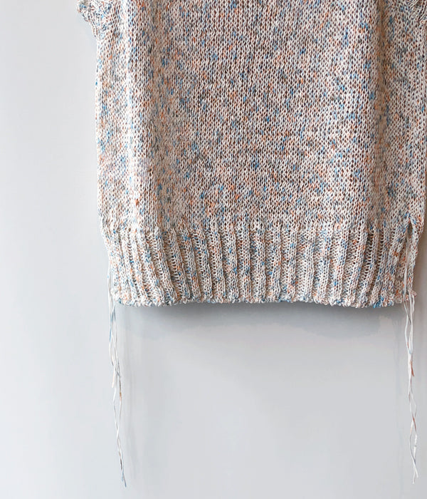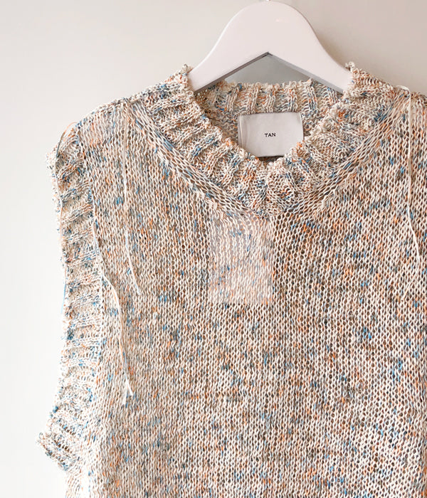 TANからPAINTED YARN VESTが入荷しました。ギマ加工のテープヤーンに特殊なペイントを施したオリジナル糸を使用したベスト。まるでキャンバスに絵を描き進めているうちに絵の具がニットに付いてしまったような、ポップな色使いがポイントです。