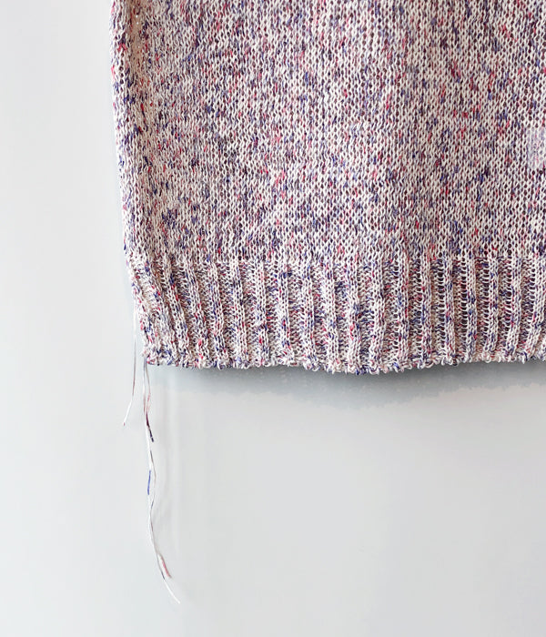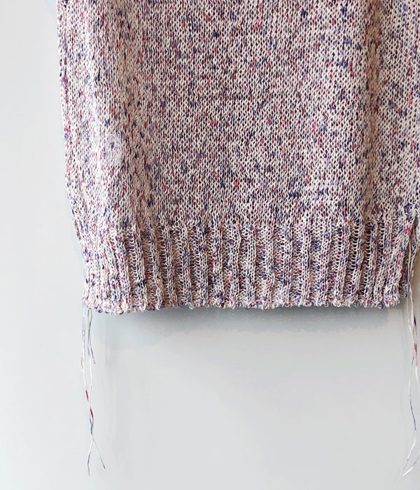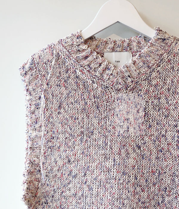 TANからPAINTED YARN VESTが入荷しました。ギマ加工のテープヤーンに特殊なペイントを施したオリジナル糸を使用したベスト。まるでキャンバスに絵を描き進めているうちに絵の具がニットに付いてしまったような、ポップな色使いがポイントです。