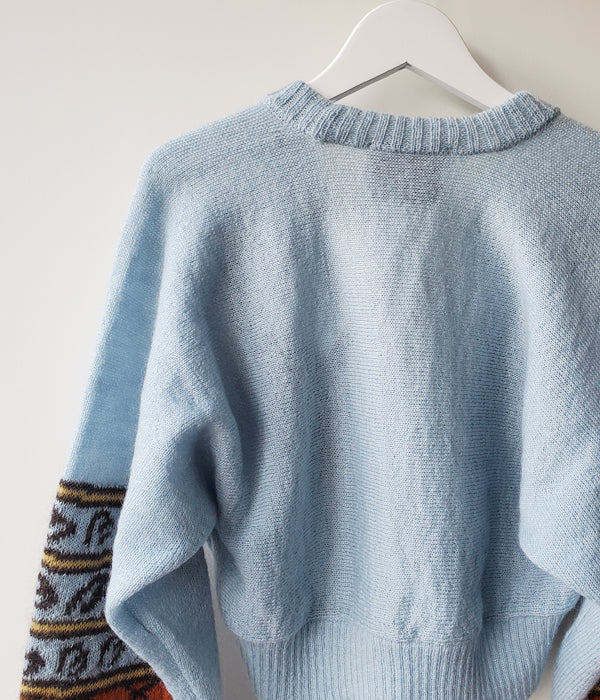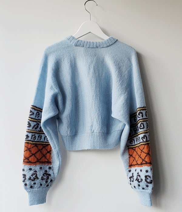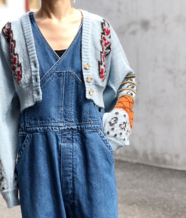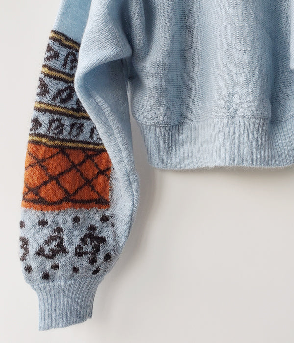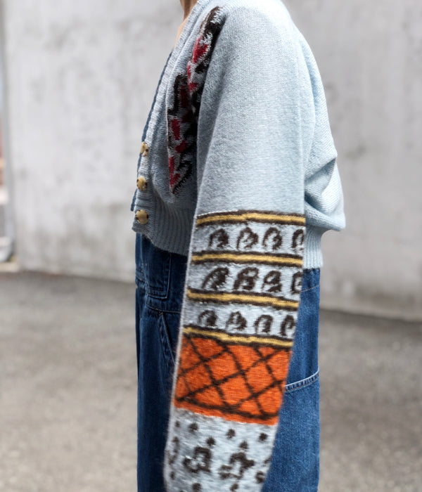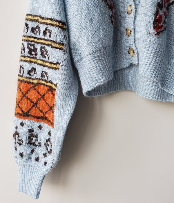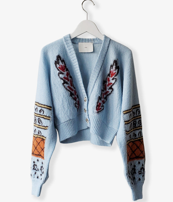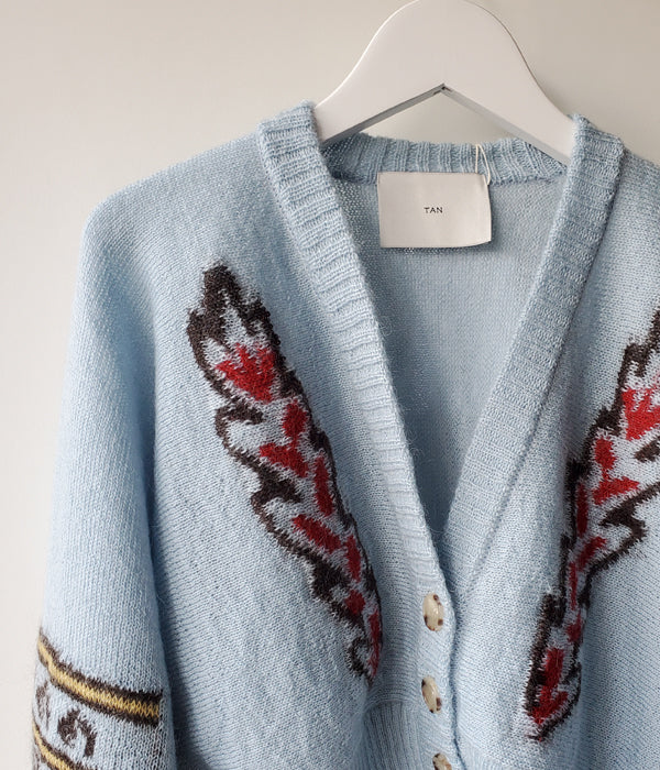 TAN/PAINTING JAQUARD V/NECK MOHAIR CARDIGAN(SAX)
