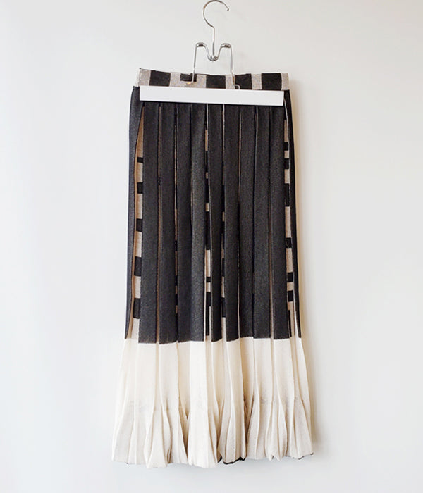TANからPLEATED BALLOON SKIRTSが入荷しました。編み組織で形状記憶させたプリーツスカート。裾は膨らみを持たせるため、折り返して変則的に点どめした手の込んだ仕様に。ウエスト周りやプリーツの隙間から覗く柄は、インテリアの壁紙や床材などをイメージ。幾何学模様パターンが風に揺れてふわり美しく広がります。柄部分と裾の透け感のコントラストがセンシュアルな雰囲気の一着です。