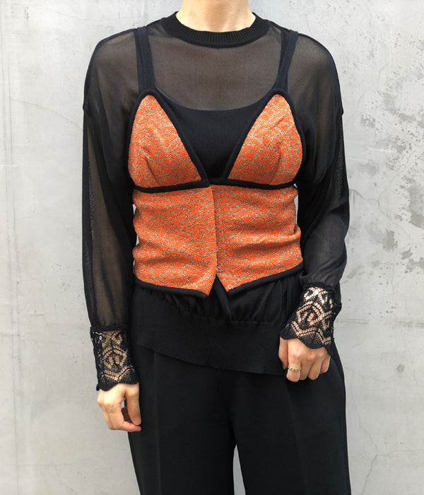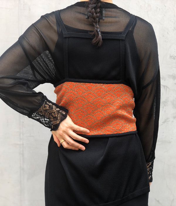 TANからWAVE PATTERN CAMISOLEが入荷しました。クラシックな和柄のパターンをラメ糸を使用しジャカードで編み立てたキャミソール。和装の帯にも見られる光沢感がポイントです。さっと羽織って着られるよう前開きのフロントホック仕様。非常にTANらしいITEMとなっています。