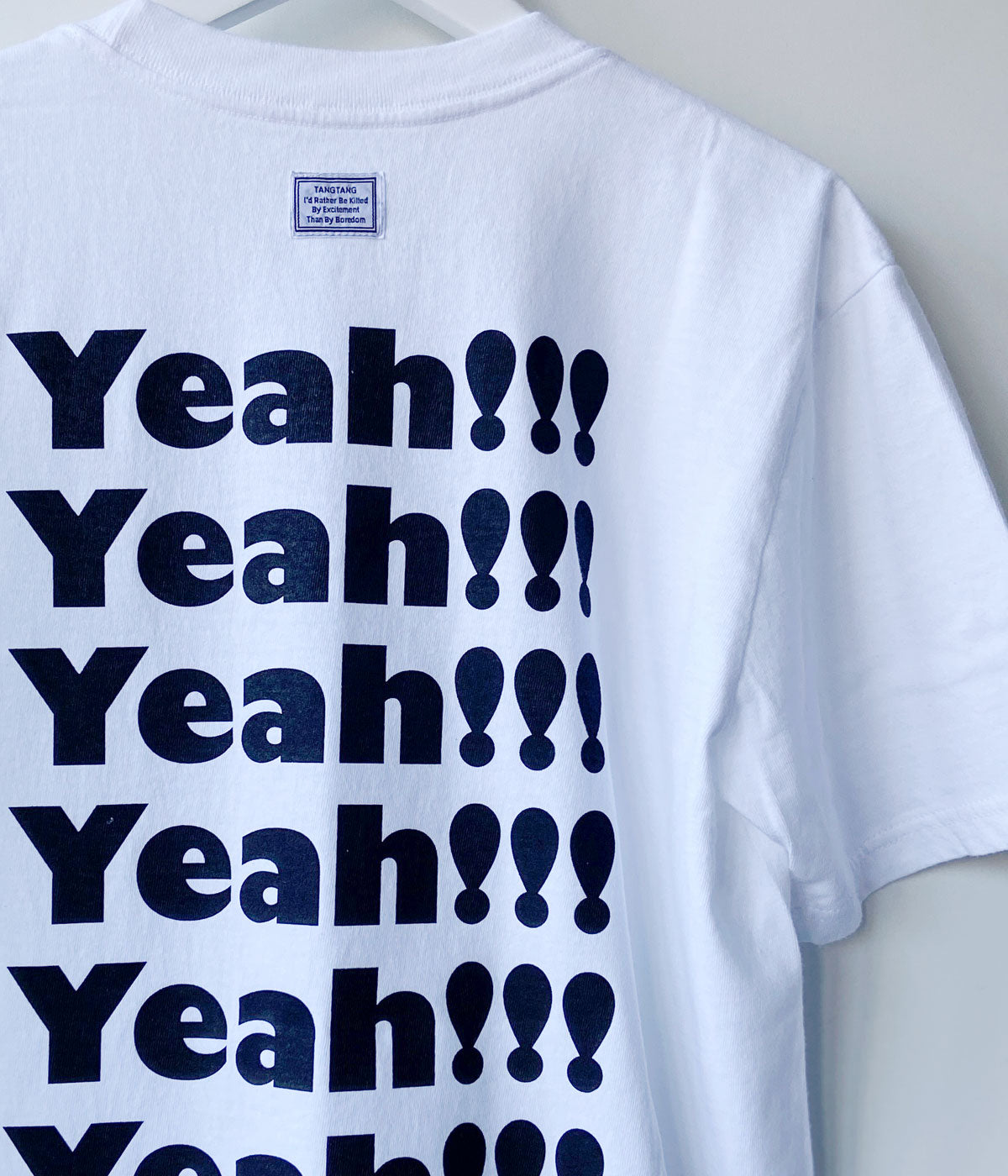 TANGTANGからAIN'T YEAH!!!(WHITE)が入荷しました。オリジナルボディーを使用。フロント、バックともにプリントを施し、シンプルなメッセージに奥行きを感じるTEE群です。ネックバックにネームを装備。I'd Rather Be Killed By Excitement Than By Boredom。