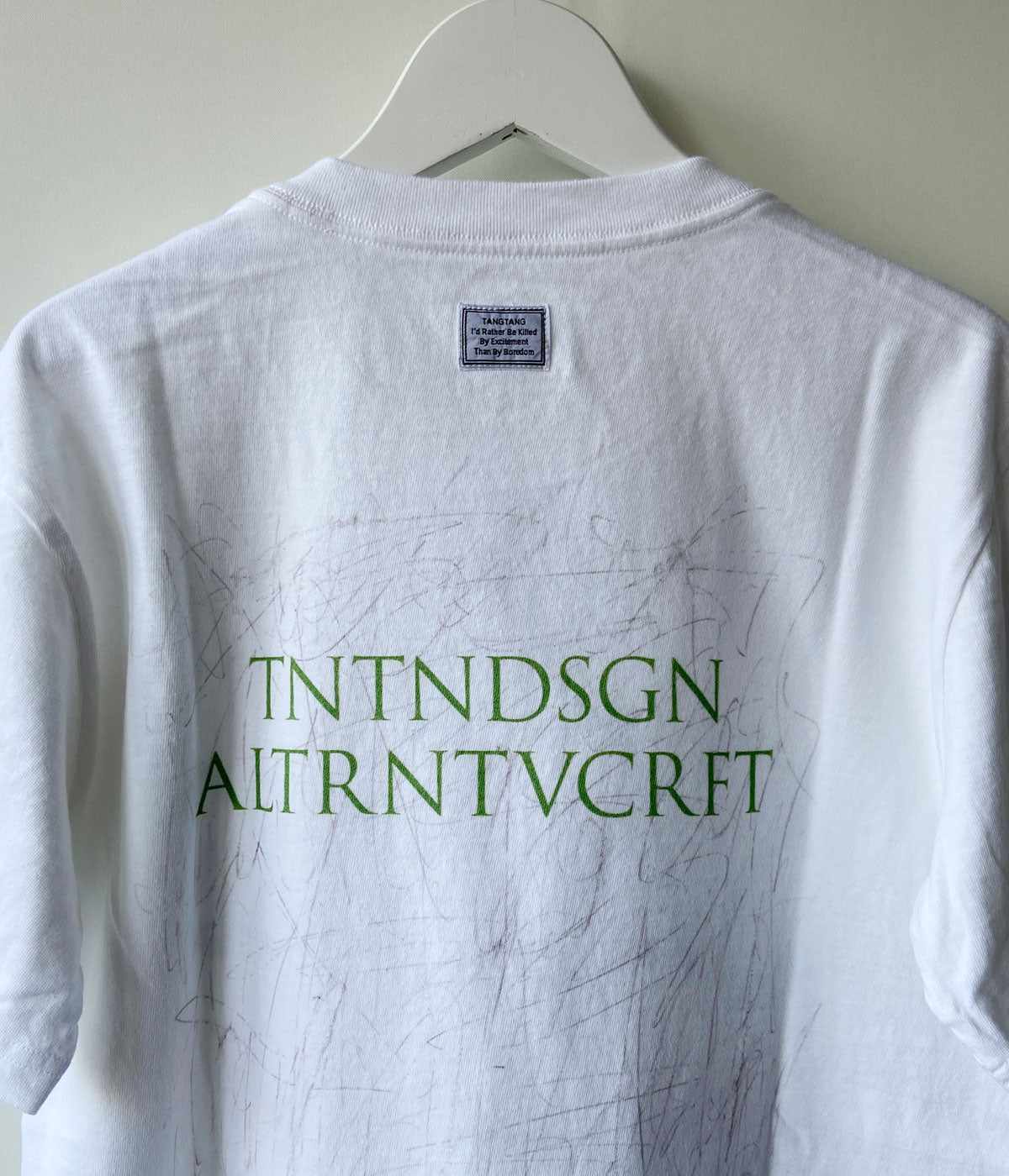 TANGTANGからBLUE NWTSH(WHITE)が入荷しました。オリジナルボディーを使用。フロント、バックともにプリントを施し、シンプルなメッセージに奥行きを感じるTEE群です。ネックバックにネームを装備。I'd Rather Be Killed By Excitement Than By Boredom。
