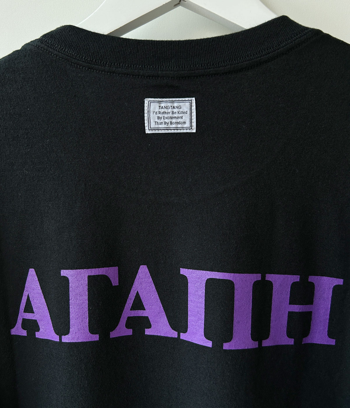 TANGTANGからGREEK LOVE(BLACK)入荷しました。オリジナルボディーを使用。フロント、バックともにプリントを施し、シンプルなメッセージに奥行きを感じるTEE群です。ネックバックにネームを装備。I'd Rather Be Killed By Excitement Than By Boredom。