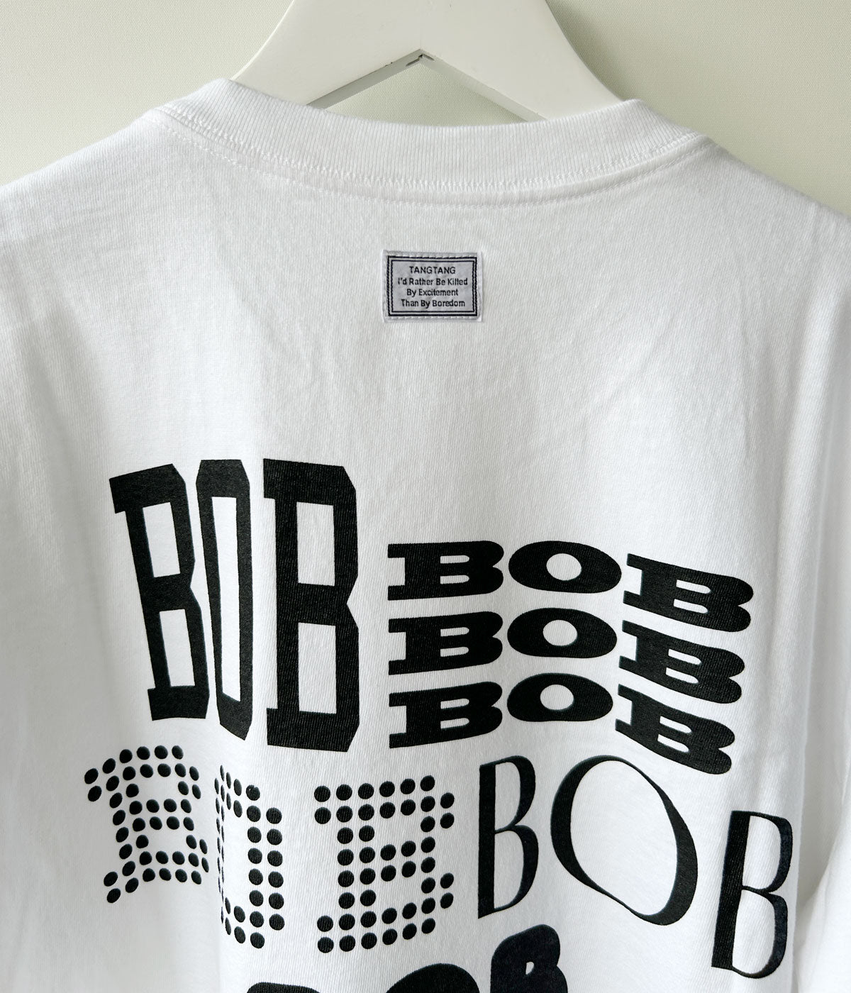 TANGTANG/SIXLOGO BOB(WHITE)が入荷しました。オリジナルボディーを使用。フロント、バックともにプリントを施し、シンプルなメッセージに奥行きを感じるTEE群です。ネックバックにネームを装備。I'd Rather Be Killed By Excitement Than By Boredom。