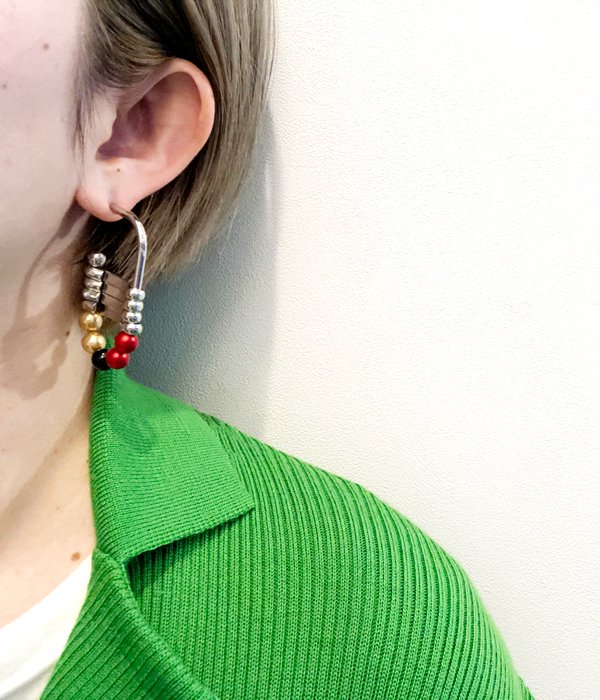 正面からと横からで見え方の変化を楽しめる、奥行きあるデザインのピアス。メタルの無機質さや重厚感とカラービーズのPOPさがクールでモードな雰囲気を演出します。