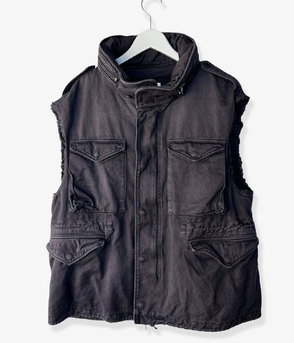 visvimから、BICKLE VESTが入荷しました。上質な超長綿を使用して織り上げた適度なハリ感のあるチノクロスを使用した、裁ち切りの袖口がインパクトのあるミリタリーベスト。ガーメントダイ x ダメージ加工による風合いがポイント。