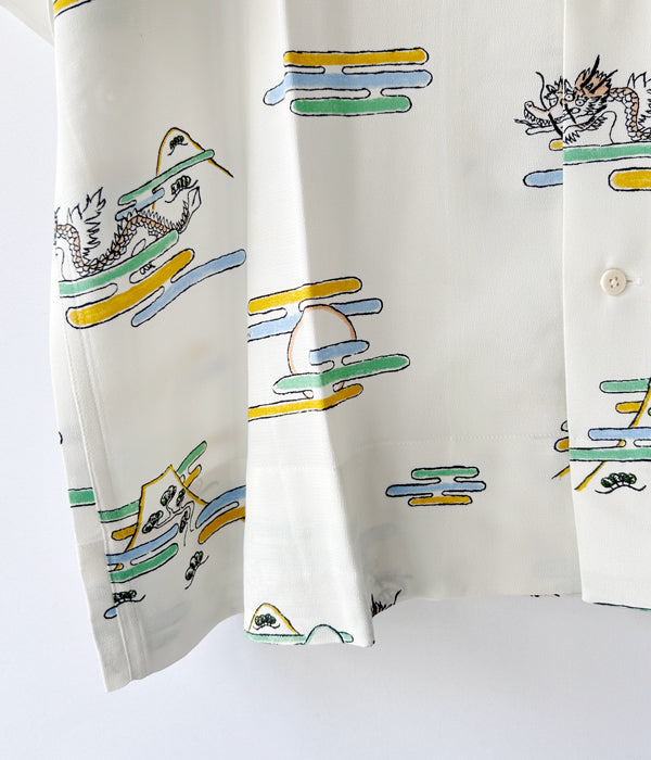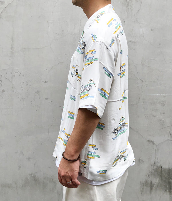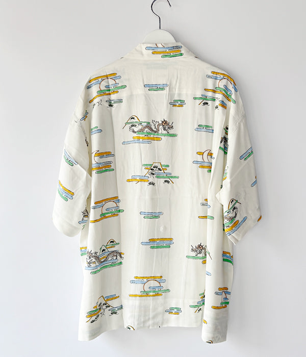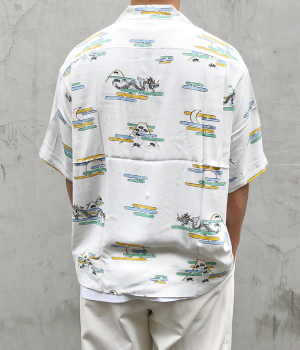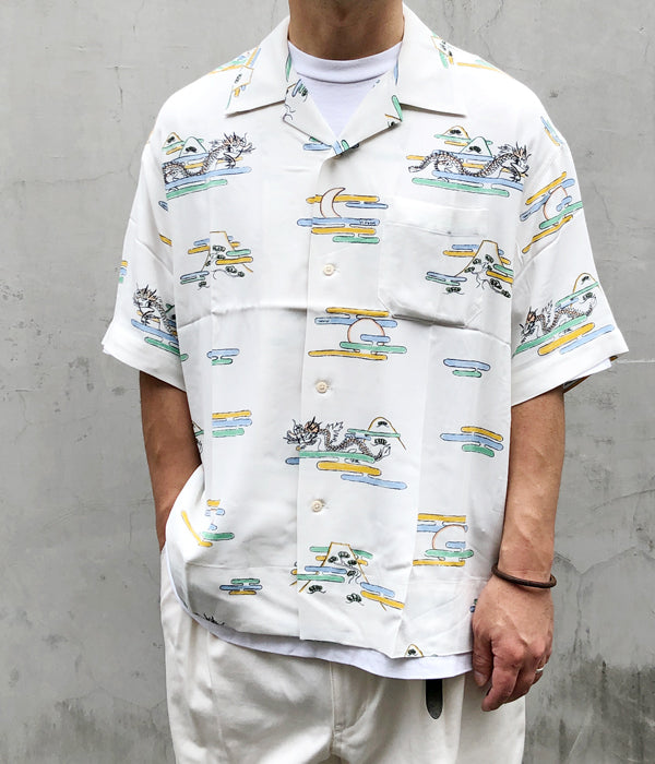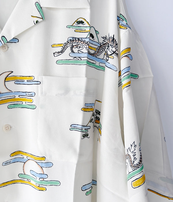 visvimから、COPA SHIRT S/Sが入荷しました。レーヨン生地を使用した開襟シャツ。雲がかかる山々を翔ける龍によるオリジナル柄をプリント。ゆったりした身幅に仕立て、オリジナルの牛骨ボタンで豪華に装飾しました。左胸のみパッチポケットが付きます。
