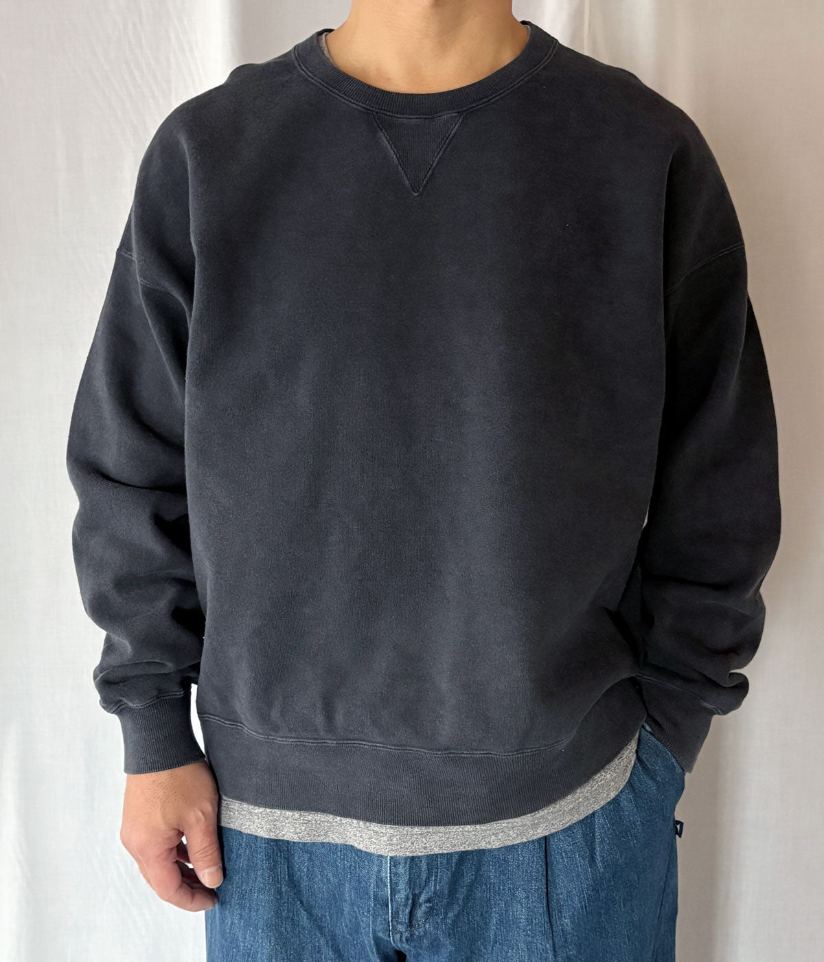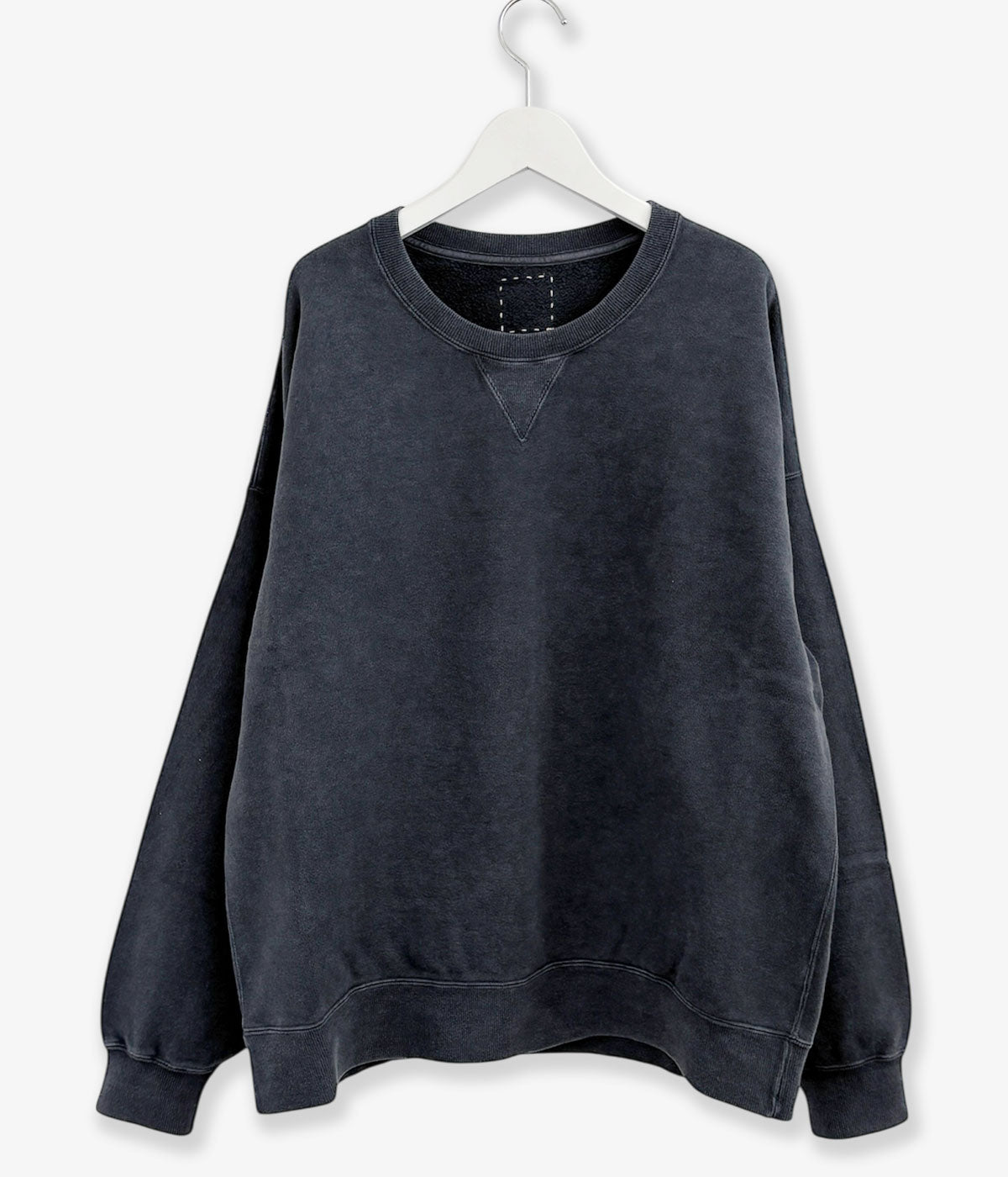 visvimから、JUMBO SB SWEAT L/S DMGDが入荷しました。コットン裏毛製のジャンボシルエットによるゆったりとしたシルエットのクルーネックスウェット。ガーメントダイとダメージ加工による自然なムラ感と、ドライタッチで油が抜けたような質感が特徴です。Vガゼット付きのディティール。