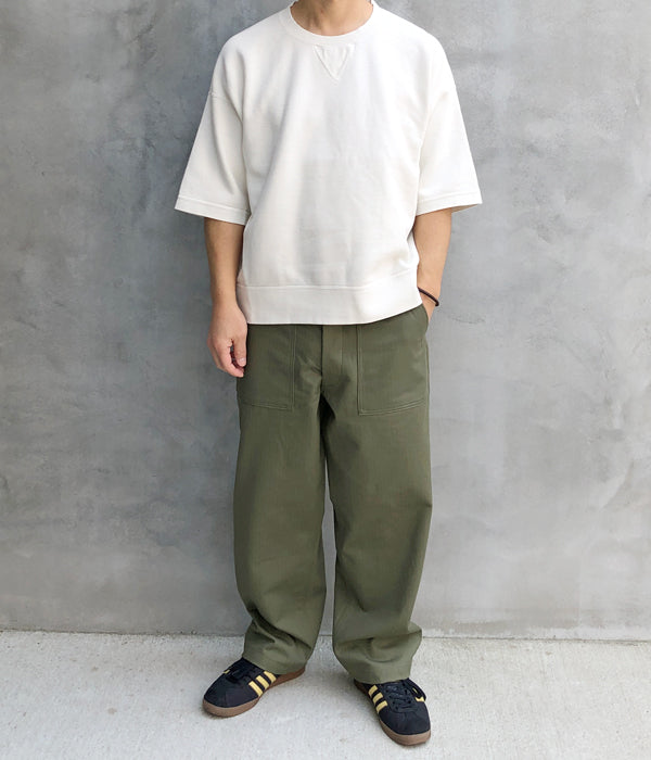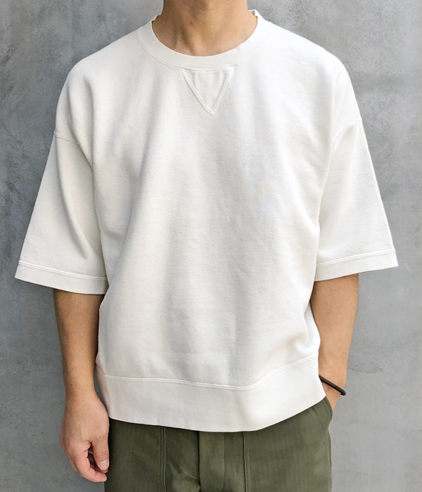 visvimから、JUMBO SB SWEAT S/S DMGD (U.D.)が入荷しました。裏毛製のコットン素材を使用し、ショートスリーブに仕立てたクルーネックスウェット。ハーフスリーブに仕立て、ドロップショルダーのゆったりとしたサイズ感。Vガゼット、リブ付きのデザイン。ガーメントダイとクラッシュ加工が施された味わい深い表も魅力。