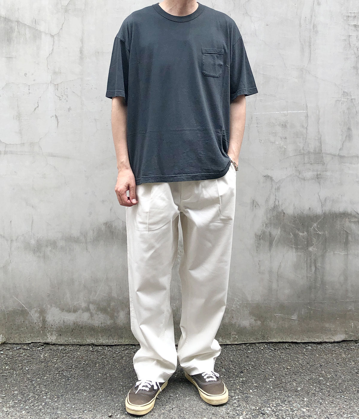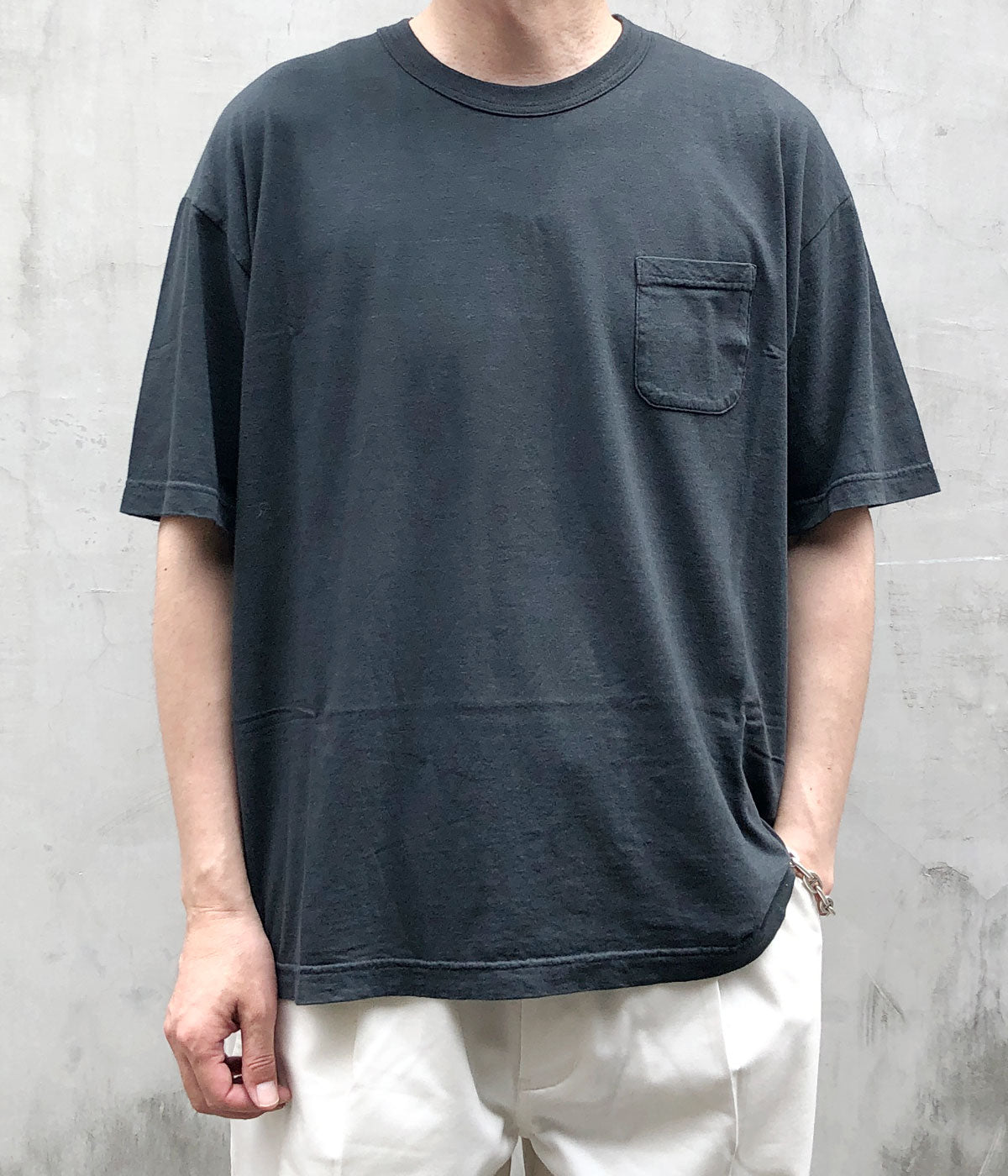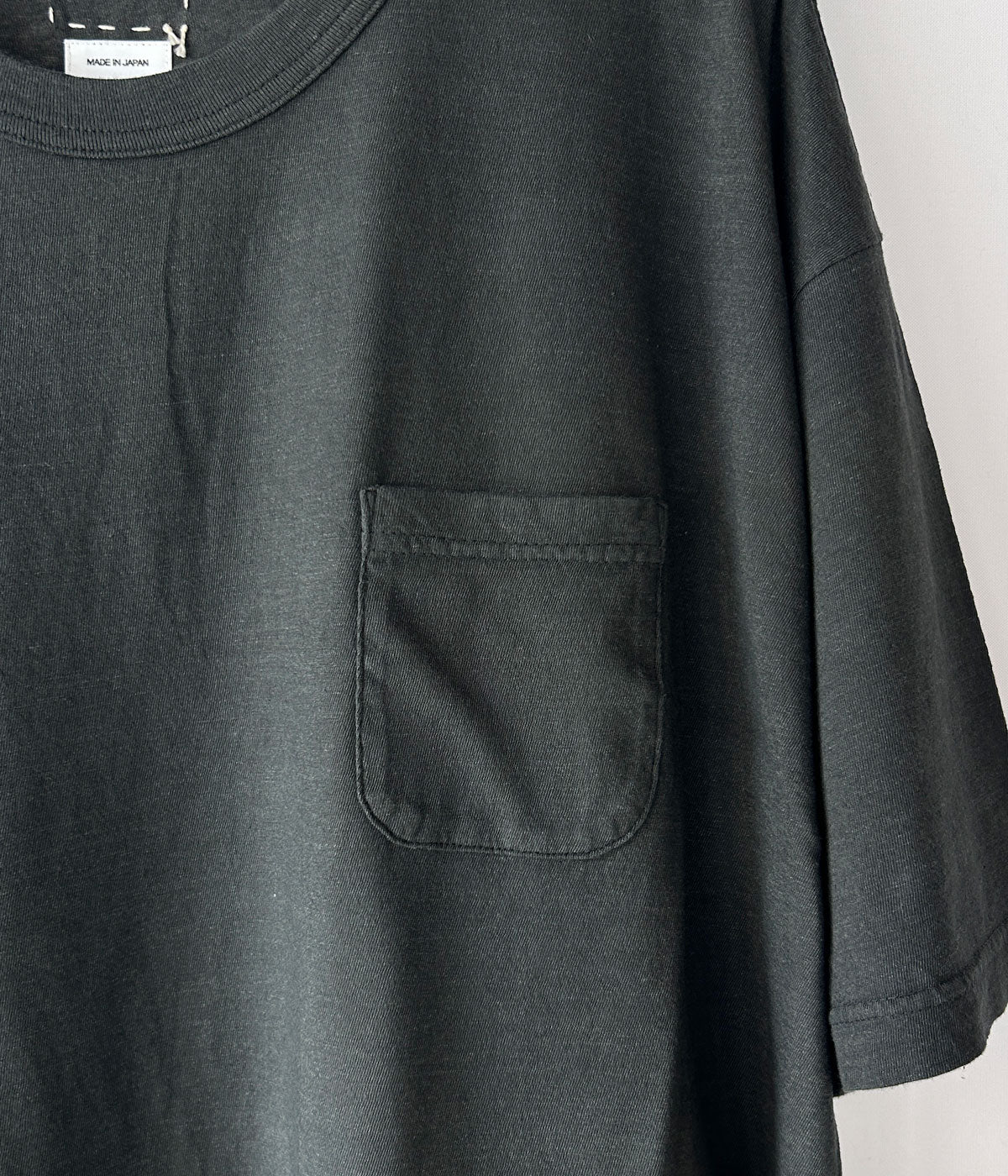 visvimから、JUMBO TEE S/S DMGDが入荷しました。コットンとナイロンのミックス素材による、とろみのある質感が特徴の天竺製の半袖Tシャツ。ガーメントダイ加工を施した味のある表情の1着。ジャンボシルエット仕立てに、小さなバストポケットでワンポイント。