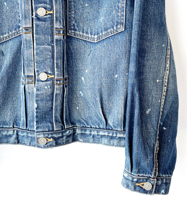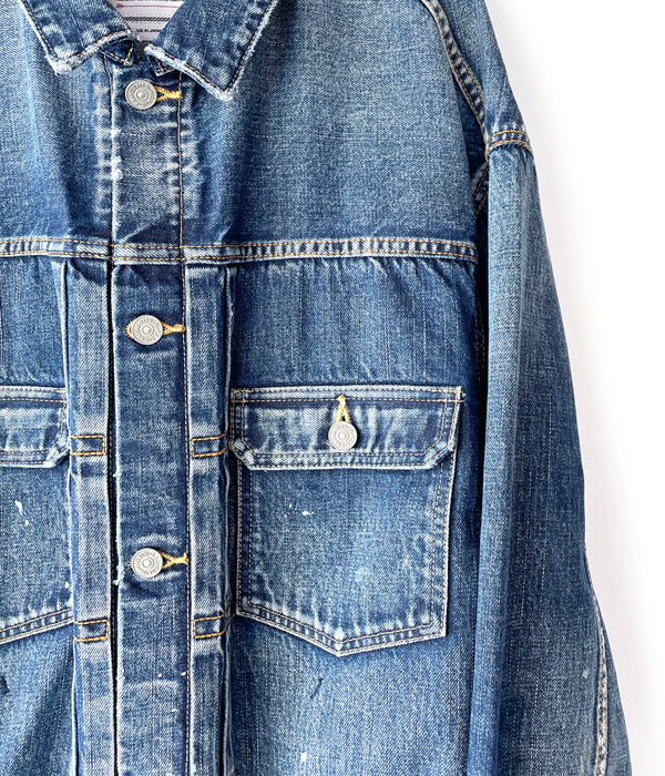 visvimから、SS 101XX JKT DMGD-1010が入荷しました。13ozのオリジナルデニム(ブルーセルビッジ)を使用し、ウォッシュ加工とペンキダメージを施したデニムジャケット。フラップポケットを2か所、サイドシーム沿いにオリジナルファスナー付きポケットを設けました。絶妙なバランスを保ちながら、ゆったりとしたサイズ感に仕立てました。天然染色加工を施したディアスキンパッチをワンポイントで。