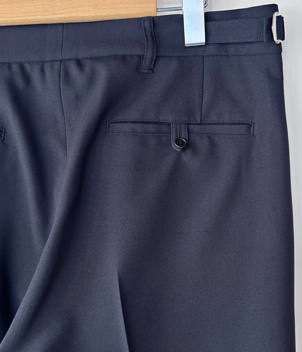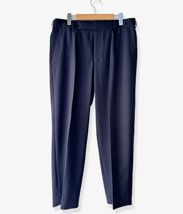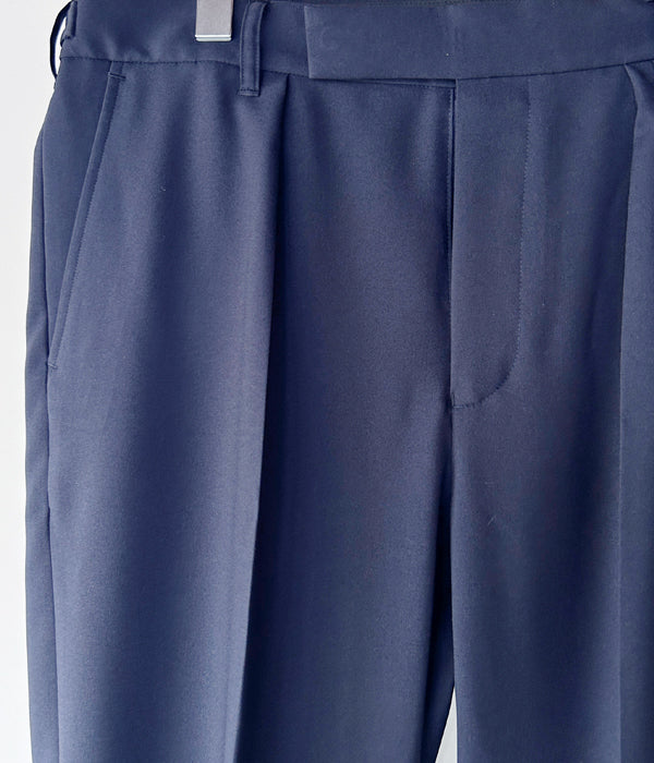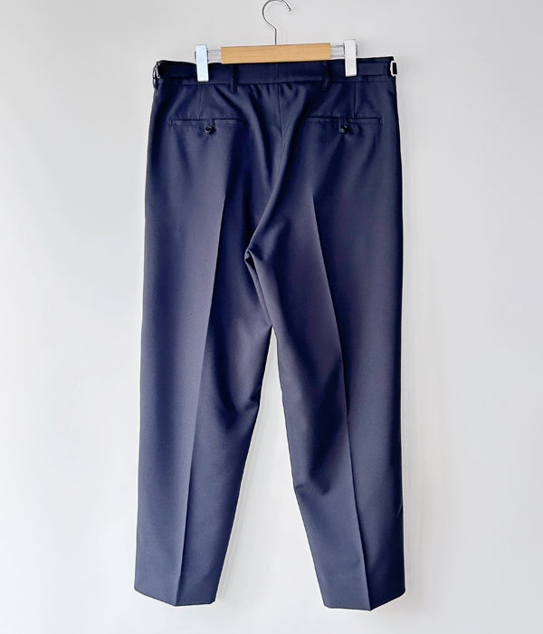 WELCOME-RAINから、1P TROUSERSが入荷しました。なめらかでとろみのあるポリエステル素材を使用したスラックスパンツです。インタックを1カ所設けたゆとりのあるシルエット、横からの流れるようなラインがとても美しいです。サイドにアジャスターを携えます。