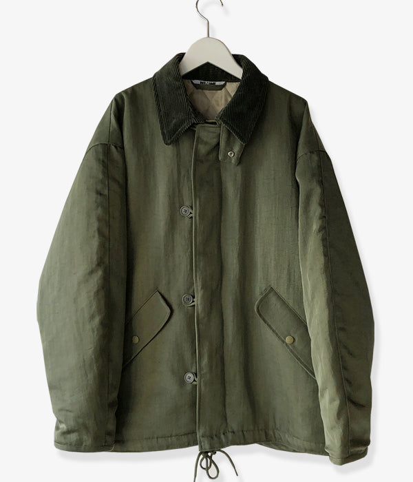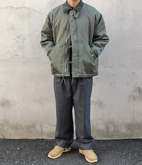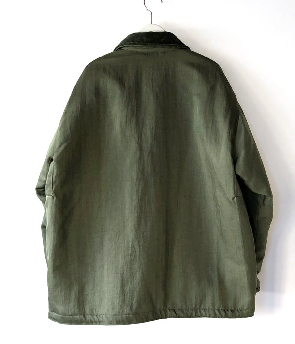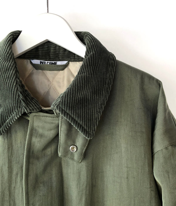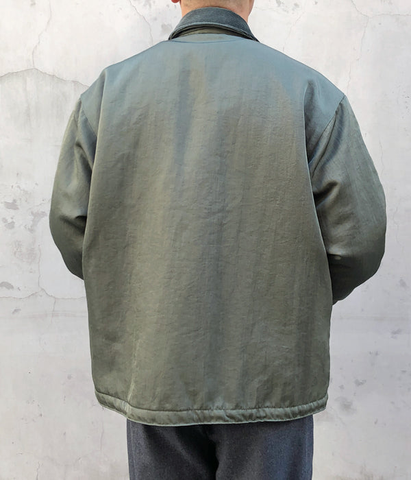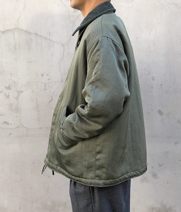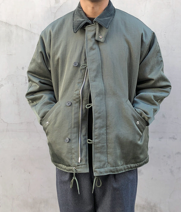 WELCOME-RAINから、DECK JACKETが入荷しました。光沢を抑えたマットで張りのあるナイロン素材を使用し、インナーに中綿入りのキルティングを配した保温性の高いデッキジャケット。襟をコーデュロイ素材に切り替え、チンストラップを備え付けたデザイン。袖口の内部に伸縮性のあるリブを備え冷気の侵入を防ぎます。ダブルジップ仕様。