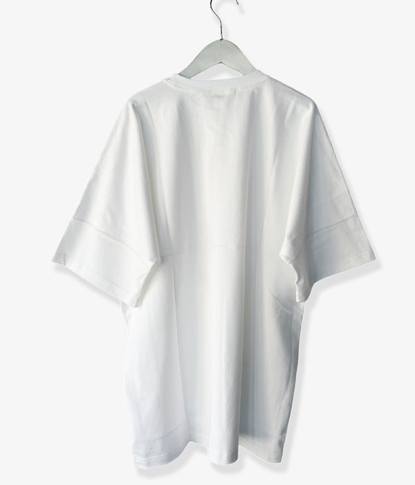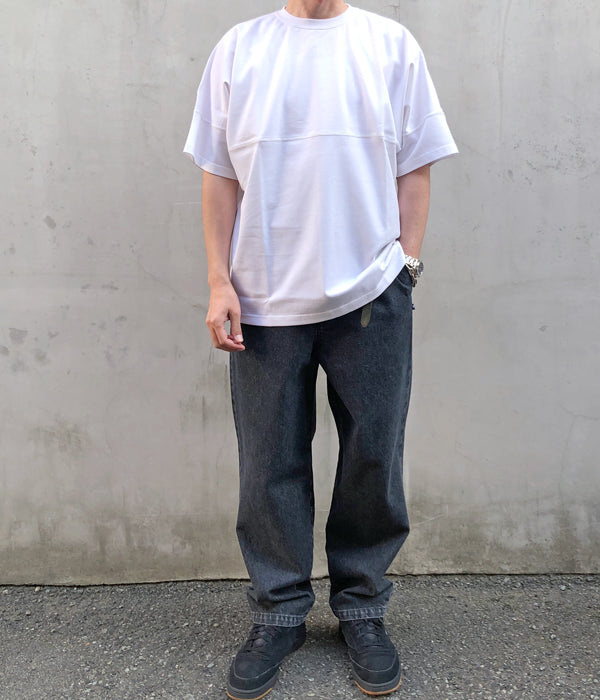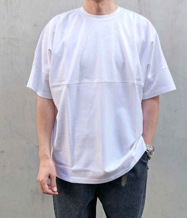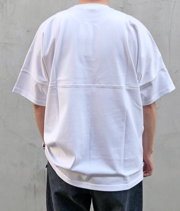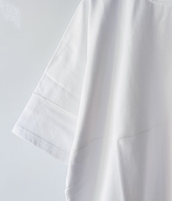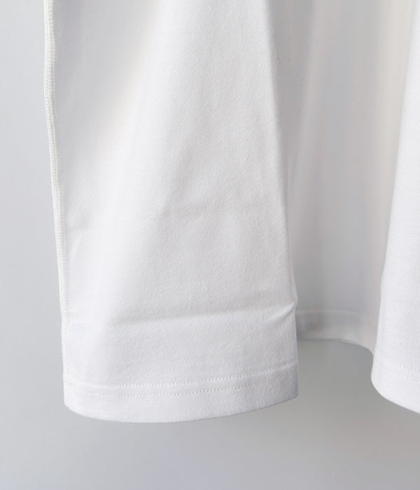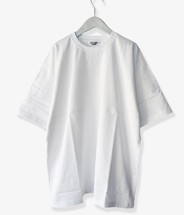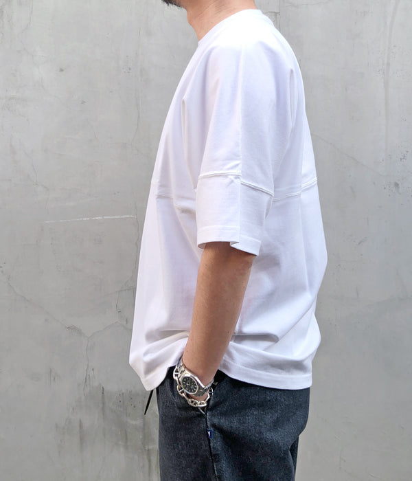 WELCOME-RAINから、NO SHOULDER HALF SLEEVE TSHが入荷しました。ふっくらとした質感と度の詰まったしっかりとした風合いのコットン生地を使用した、長めの袖が特徴のTシャツ。立体的なノーショルダーパターンで構成され、胸元と袖口にロック始末で施した切り替えがポイント。ゆったりとしたサイズ感に仕立てました。