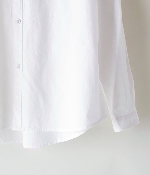 WardrobeラインのBASICなコットンシャツ。前立てから襟、カフスを細身に仕上げ、ボタンはボディと同素材の包みボタンで仕上げました。デイリーに着まわせるオーセンティックなシルエットです。