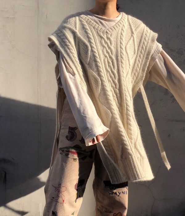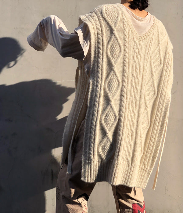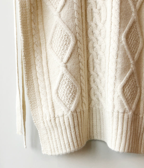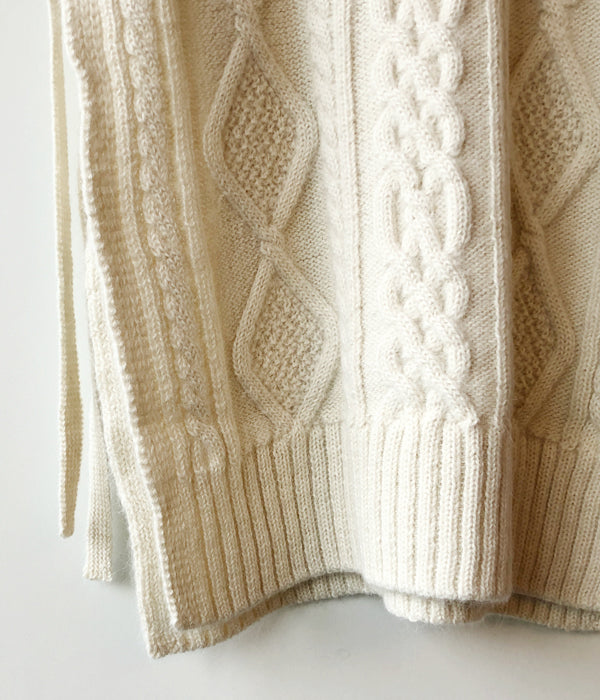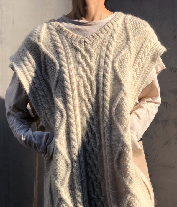 WRYHTからFISHERMAN SQUARE TOPSが入荷しました。ポンチョやケープのようなスクエアシルエットのノースリーブトップス。今シーズンは天然のアルパカを度詰めにして編み立てています。ふわっと軽く心地よい肌触りに、毛足の長い表情に温かみを感じます。付属のウエストベルトの結び方でシルエットを変えて楽しめます。