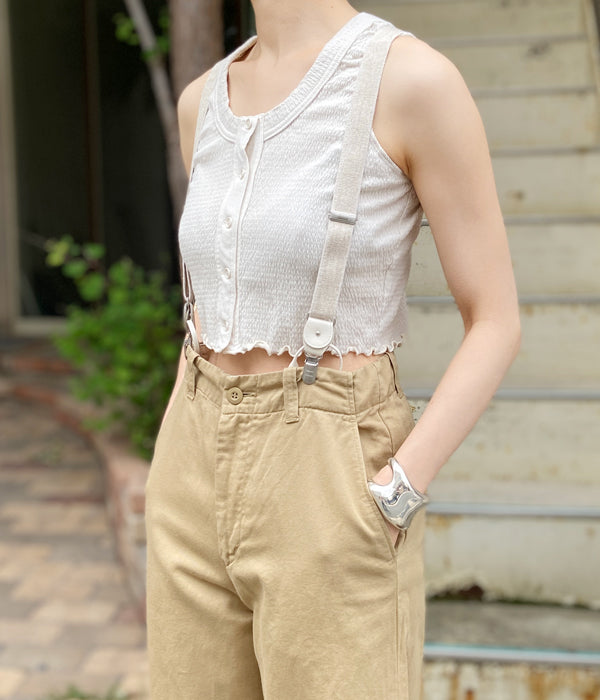 WRYHTからHANDSOME BRACESが入荷しました。ハンサムに着こなす上でエッセンシャルなグッズのサスペンダー。深い股上のトラウザーズのシルエットをよりよく見せてくれるアイテムです。アールデコのモチーフが手彫りで施されたオリジナルパーツもクラシカルでハンサムな雰囲気を盛り上げてくれます。