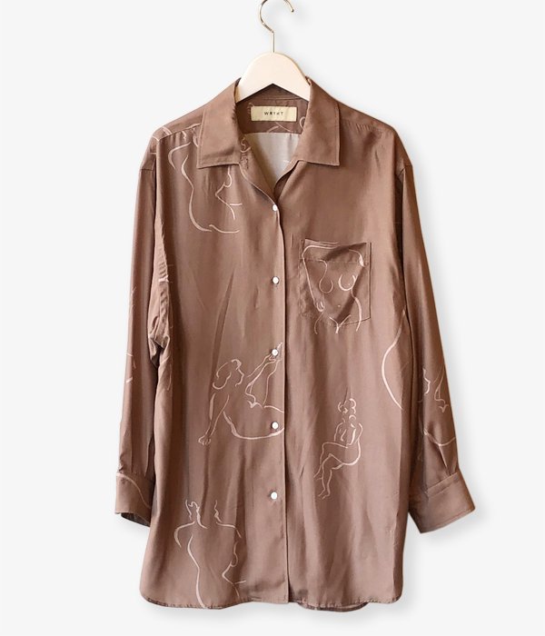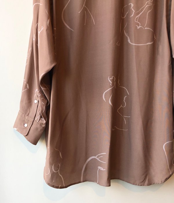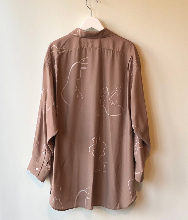 WRYHTからONE-PIECE COLLAR BLOUSEが入荷しました。ワンピースのパターンからデザインされたオープンカラーのシャツ。どこか懐かしさの漂う雰囲気とドローイング柄が見事にマッチ。ゆったりしたシルエットながら光沢感のある生地とカラーリングでカジュアル過ぎずクリーンなイメージで着用できる一枚です。