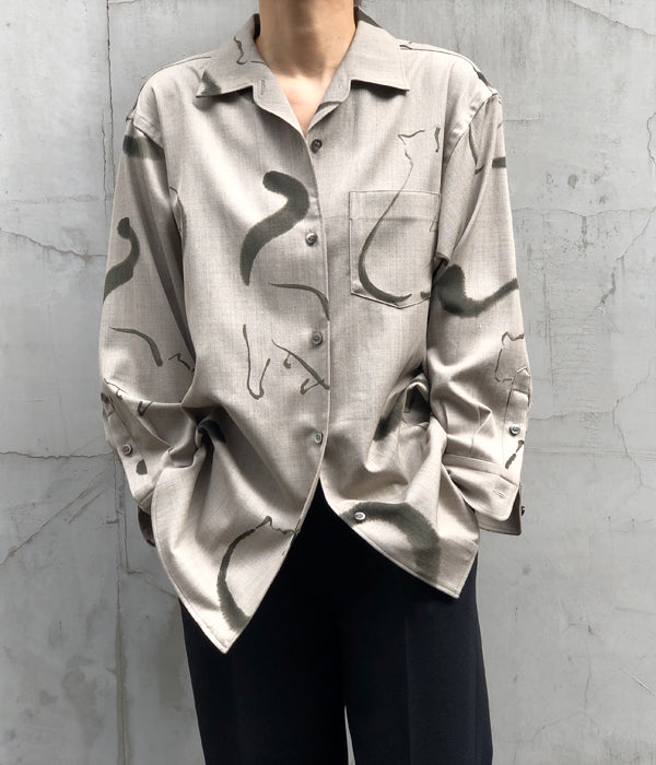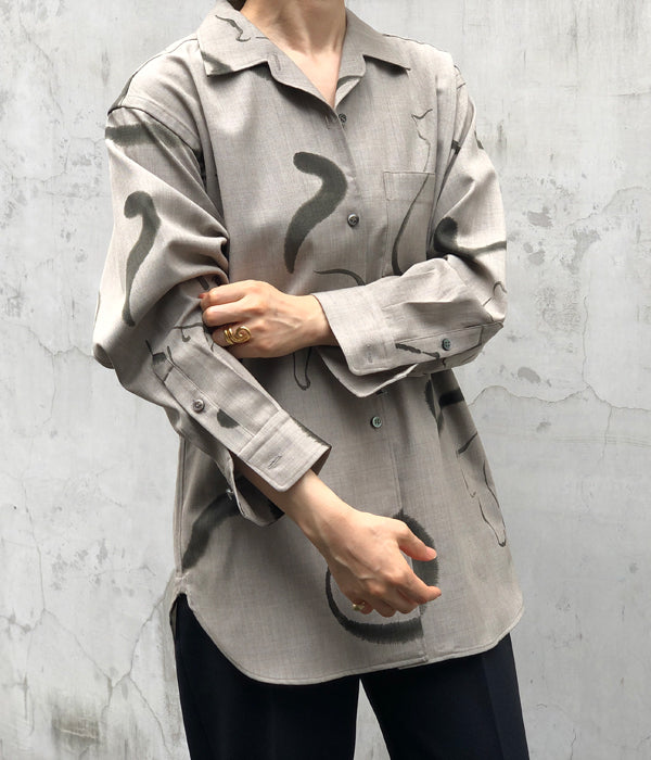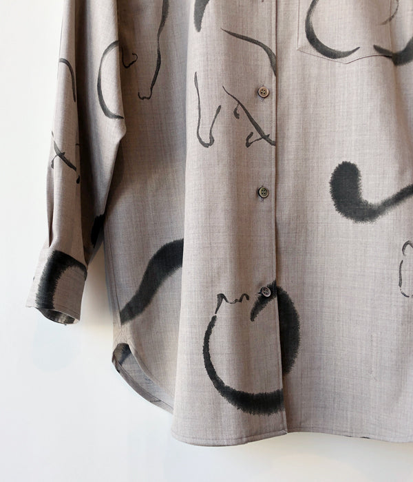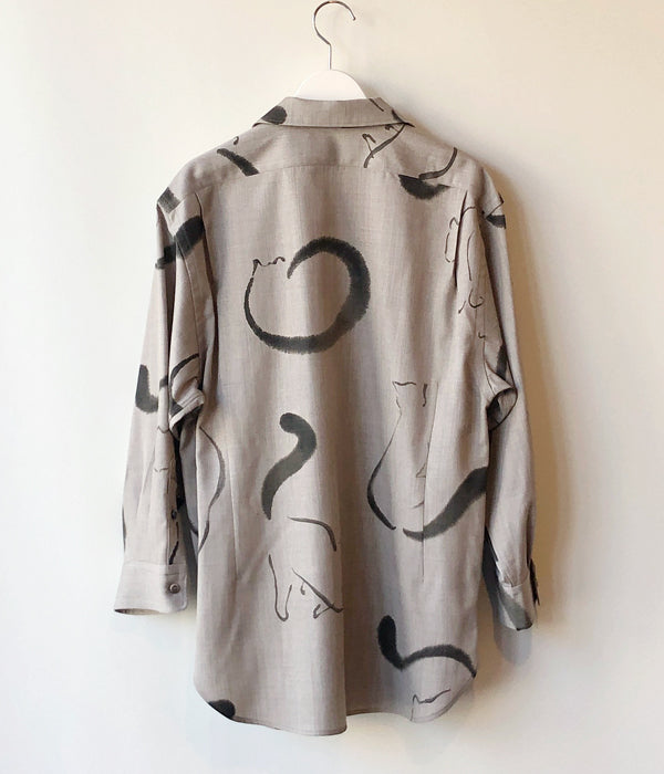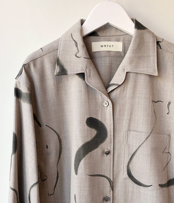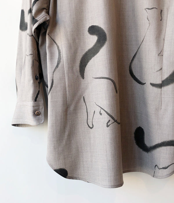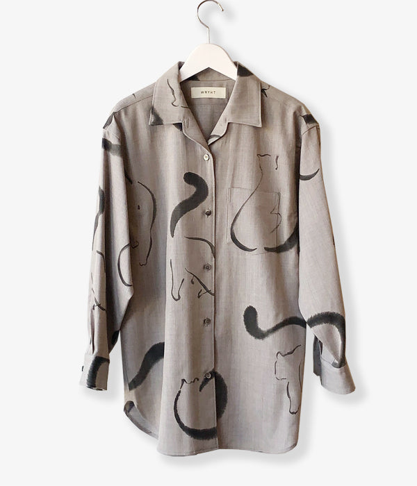WRYHTからONE-PIECE COLLAR BLOUSEが入荷しました。台襟のない一枚つづきの襟回しのオープンカラーシャツはWRYHTのシグネチャーピースのひとつです。今シーズンは生地をウールに変え手描きの猫がモチーフとなり水墨画の様なインクの滲みなどを表現。 渋さも感じられるタッチと、愛嬌のある猫たちが他にはない雰囲気を醸し出しています。