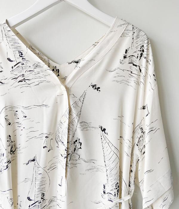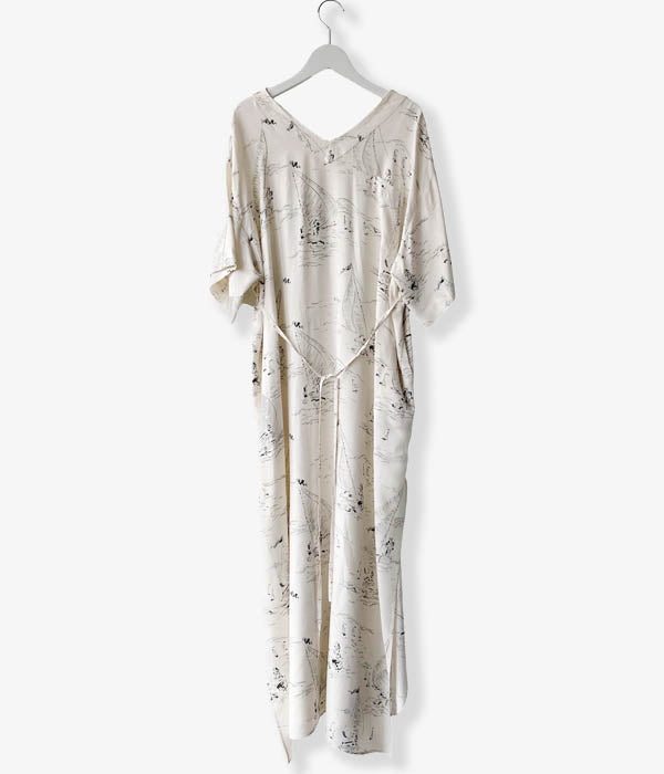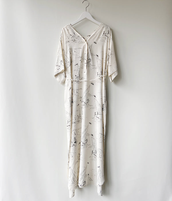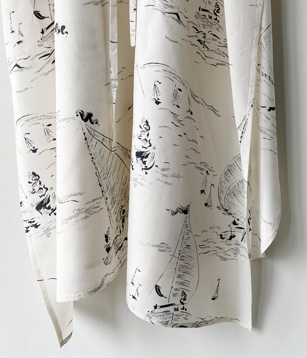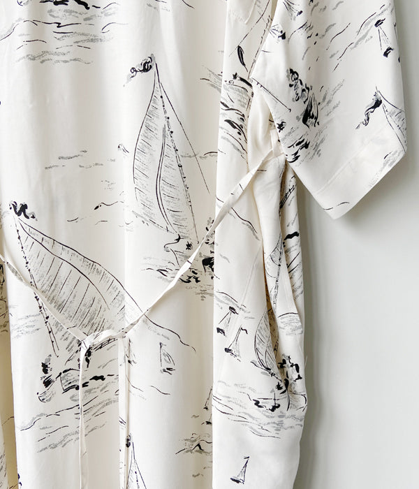 WRYHTからSLIT NECK PAJAMA DRESSが入荷しました。デザイナーが敬愛する作品、芸術家に焦点を当て現代的にリドローイングしアップデートしたオリジナル柄。マリンはミッドセンチュリーのアーカイブに倣い制作したヨットパターンで、とぼけたタッチがノスタルジーなムードを醸し出しています。ミッドセンチュリー期のメンズパジャマからのインスピレーションのワンピースはフロント、バック、どちらも違う表情をしているのでその日の気分で楽しめます。 またウエストに配したベルトでシルエットをアレンジすることも可能。