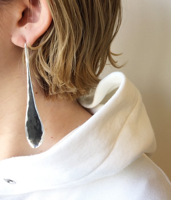 水が滴る一瞬をとらえた、しずくの美しさを表現したピアス。シルバーの滑らかな表面から放たれる煌めきが、顔まわりを華やかに演出します。