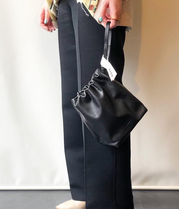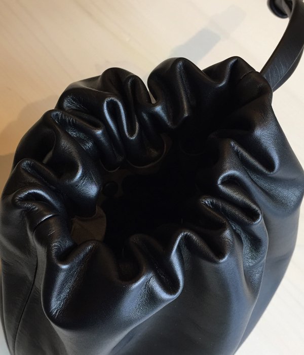 レザーのタフなイメージとコロンとしたフォルムの可愛らしさが見事に融合した巾着型ポーチ。キメの細かいキップレザーをより少ないアクションで形成することにより生まれる洗練された雰囲気が堪らない逸品。