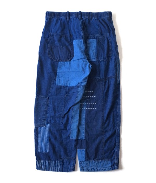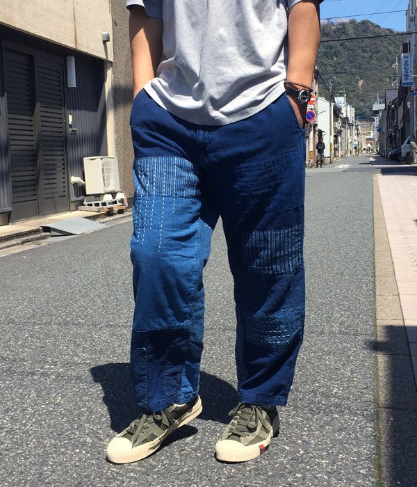 大胆なパッチワークで構築したリラックスシルエットのパンツ。ゴム入りのドローストリング仕様と併用してベルトループも設けました。フランネル素材の肌当たりの心地良さも特筆モノ。