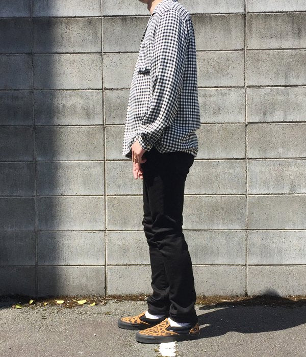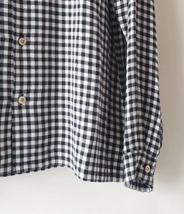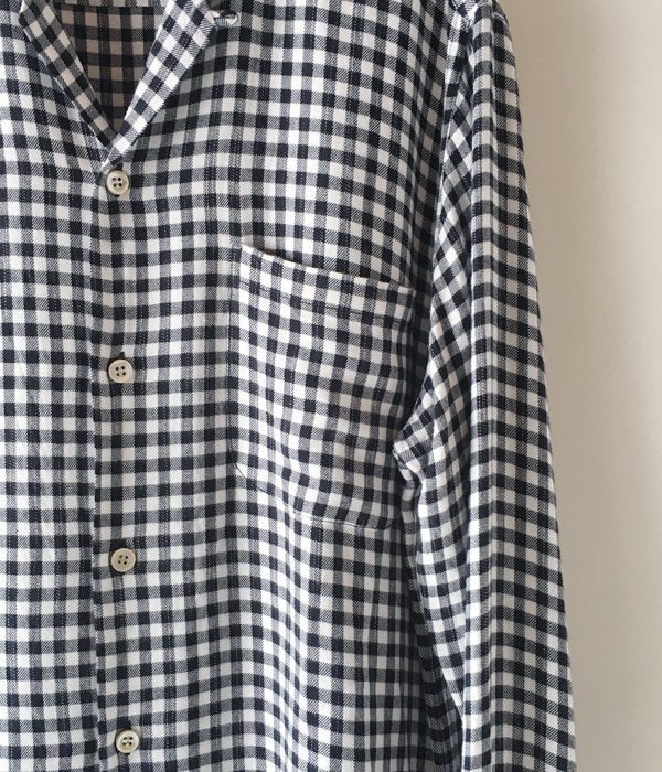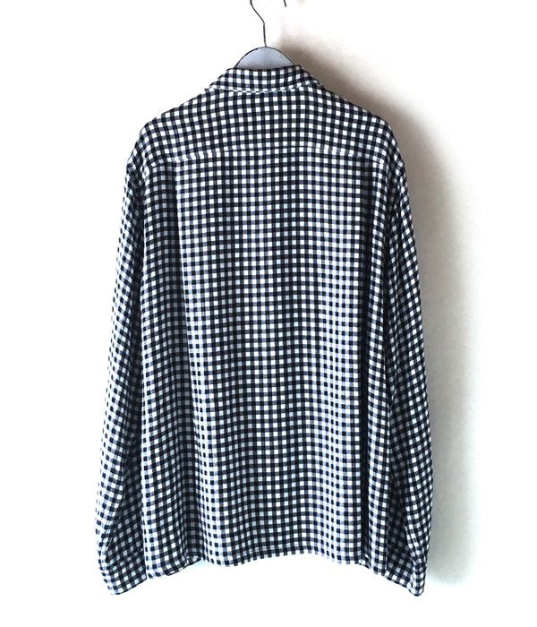 レーヨン素材のドレープ感が作り出すシルエットが美しく、オープンカラーのいなたさも面白い開襟シャツです。柄の王様ギンガムチェックをチョイスしました。