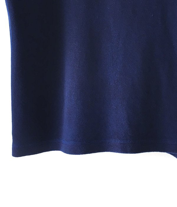 梨のような凹凸のある質感の、伸縮性のあるコットン素材のカットソーです。肌離れが良く汗ばむ季節も快適な着用感です。手染めによる濃い藍色が夏空に映える一着。