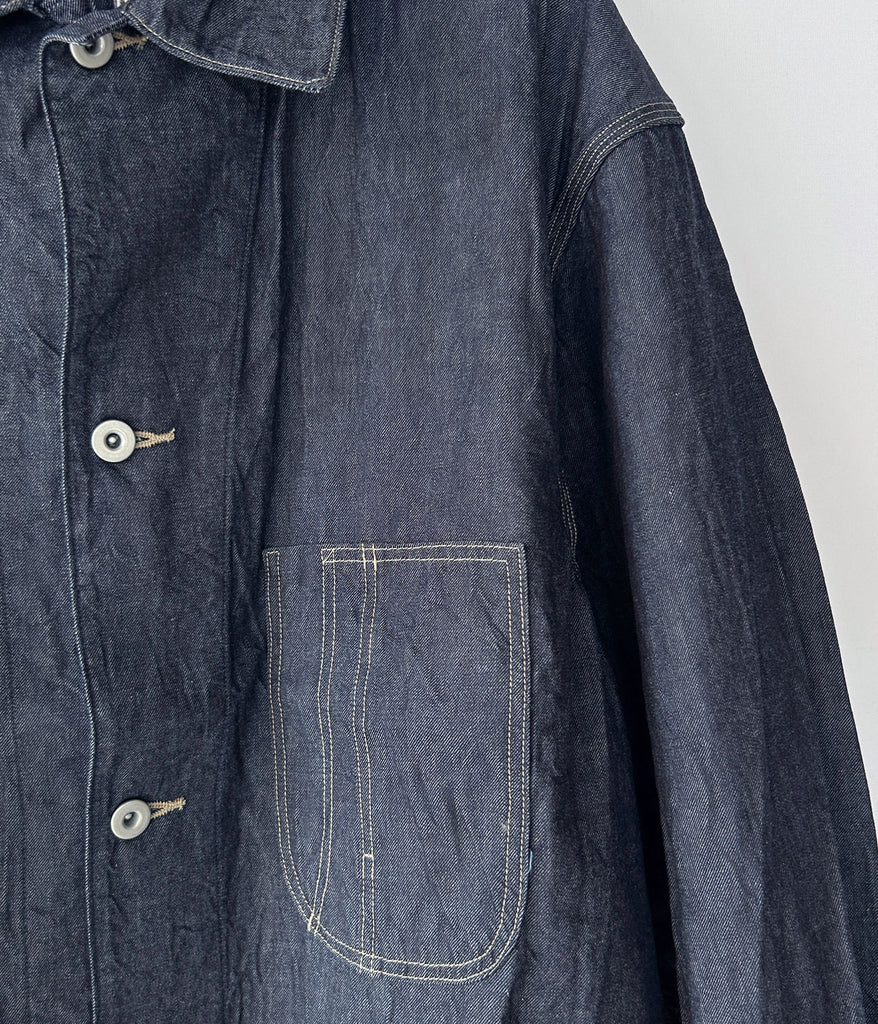 blurhms ROOTSTOCKから、 LIGHT OZ DENIM COVERALLが入荷しました。軽めのオンスのデニムを使用したクラシックなデザインのカバーオール。台襟を設けないカジュアルなレギュラーカラーに、フロントのドーナツボタンがワークテイストを主張します。左右の大きなパッチポケットに、左胸にはペンポケットとサイドアクセスポケットを備えます。右胸に位置する内ポケットのステッチが表地にアクセントを与えたワンポイントデザインに。