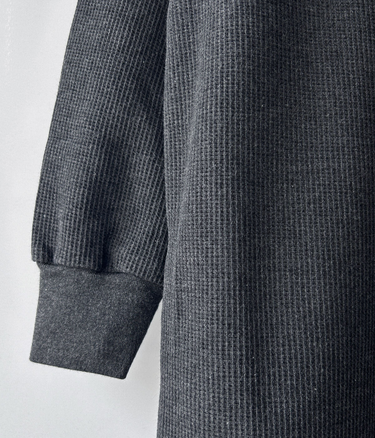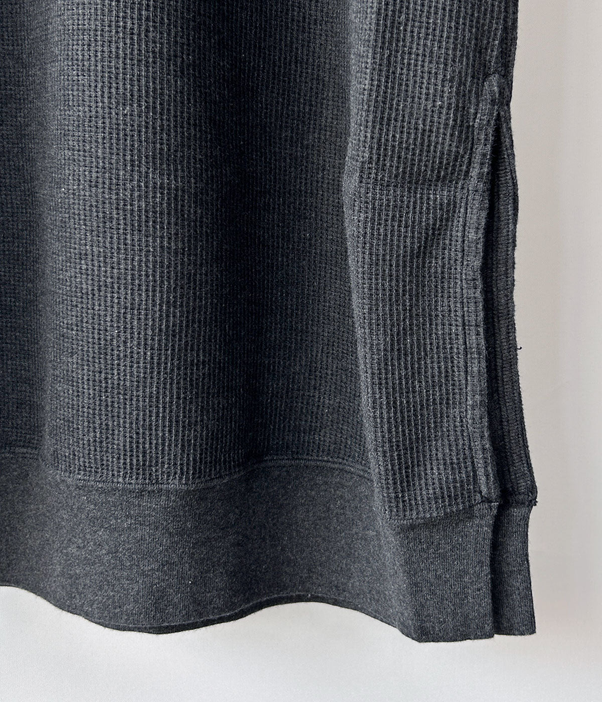 blurhms ROOTSTOCKから、ROUGH&SMOOTH CREW-NECK DRESSが入荷しました。表地は凹凸のある質感、裏地はフラットに仕上げたこだわりのワッフル生地を使用し、クルーネック&ラグランスリーブで仕立てたワンピースドレス。素材由来の光沢感のある表情と、洗いをかけたこなれた雰囲気がポイントです。サイドにポケットを備え、リブ付きの裾周りには両サイドにスリットを設けました。
