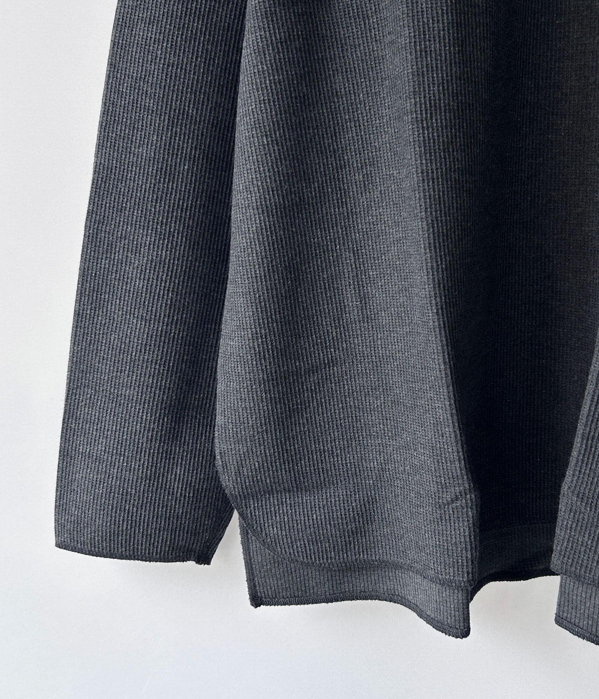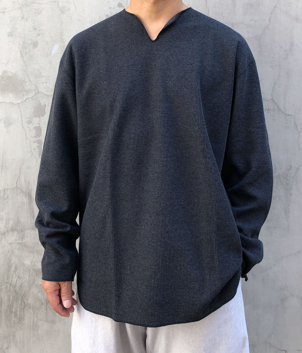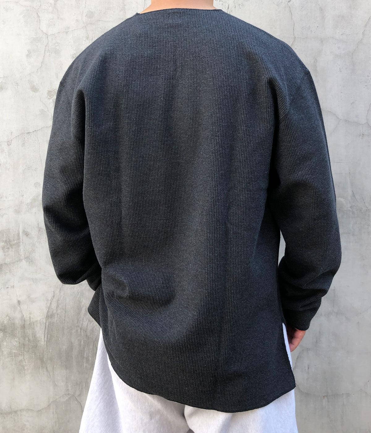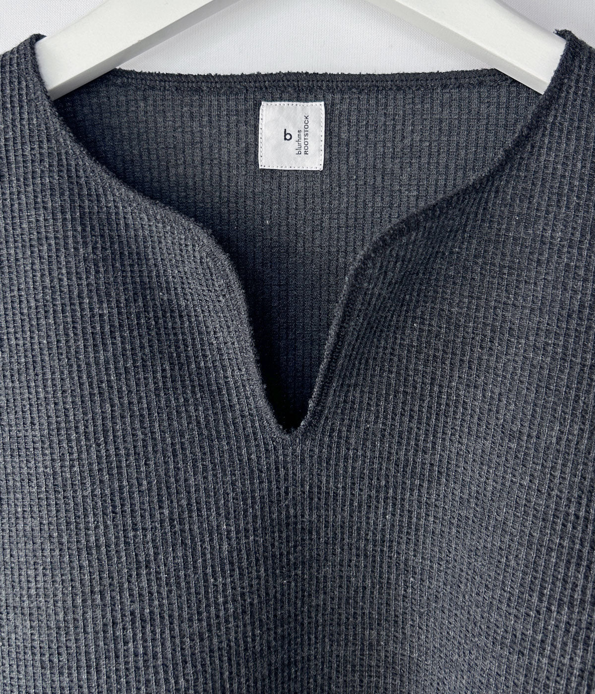 blurhms ROOTSTOCKから、ROUGH&SMOOTH THERMAL OVER NECK LSが入荷しました。表地は凹凸のある質感、裏地はフラットに仕上げたこだわりのワッフル生地を使用し、ネックの切込みや裾周りをオーバーロックで仕上げたラフな雰囲気をまとったLS。素材由来の光沢感のある表情と、洗いをかけたこなれた雰囲気がポイントです。