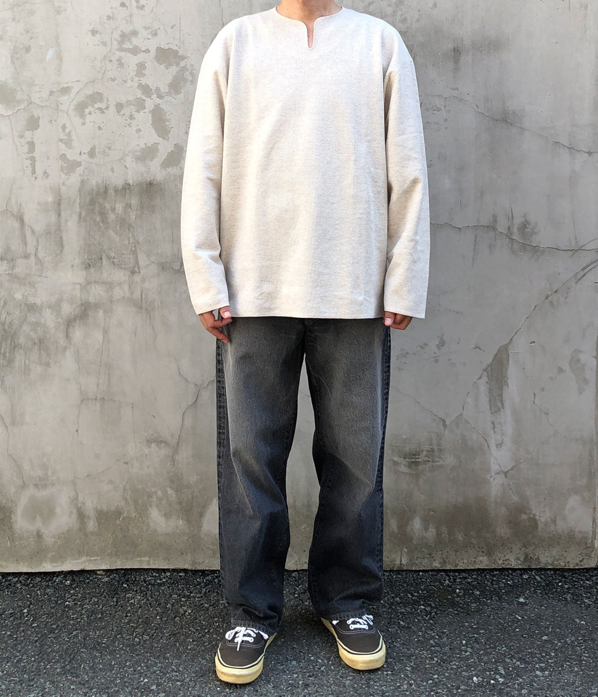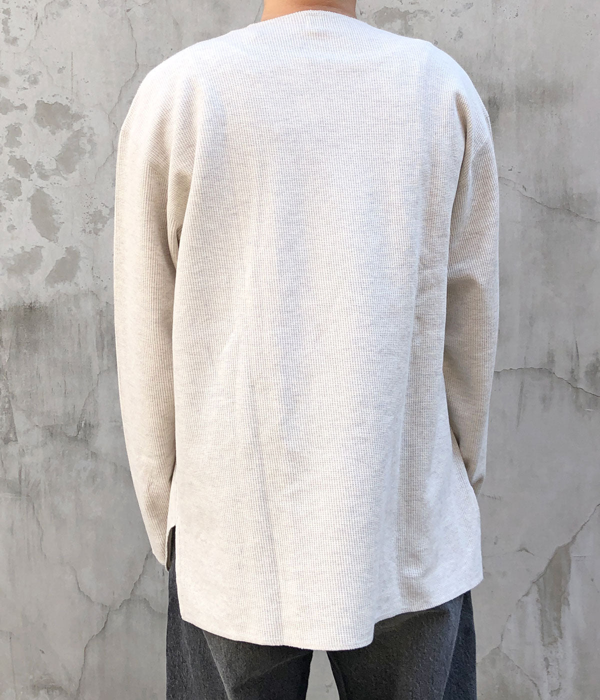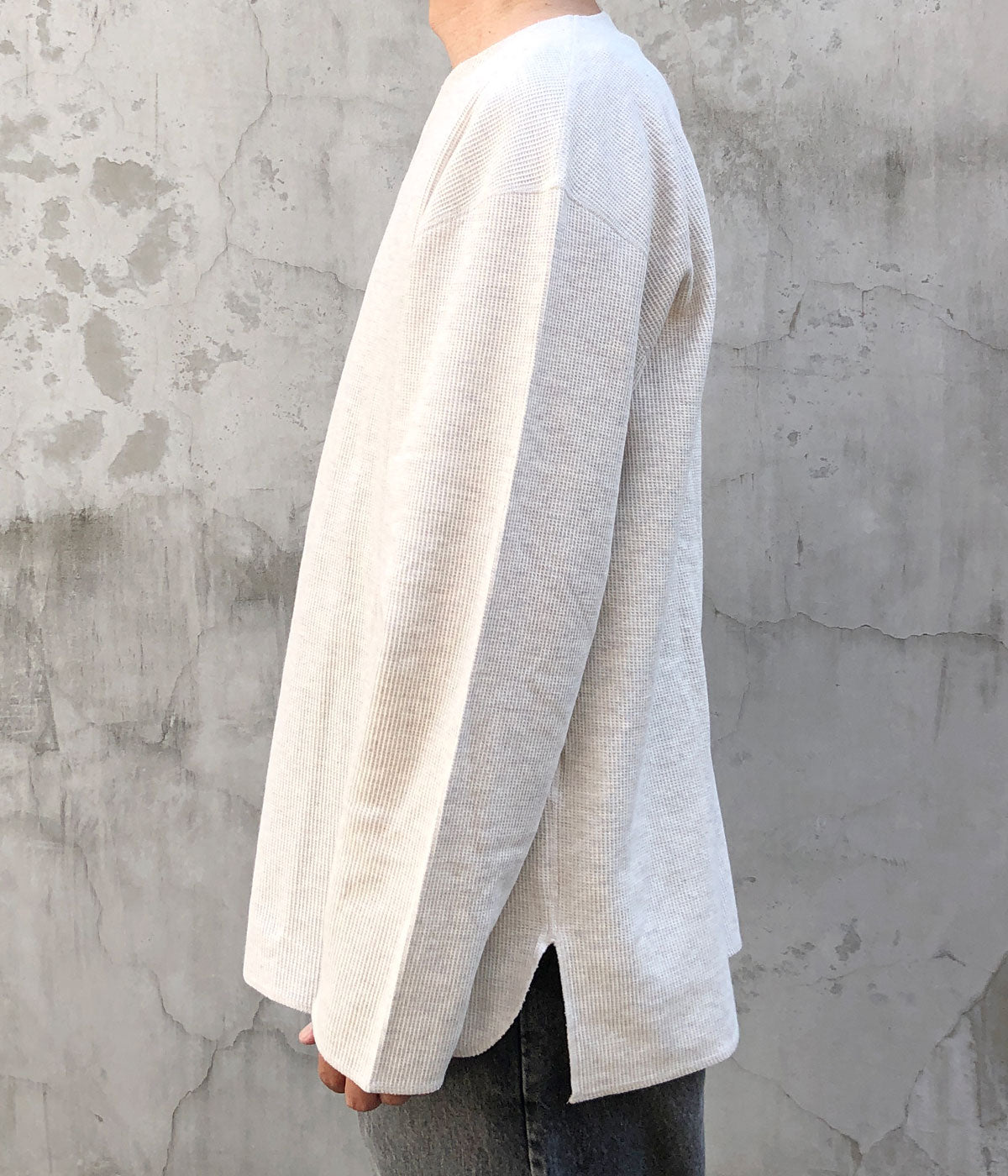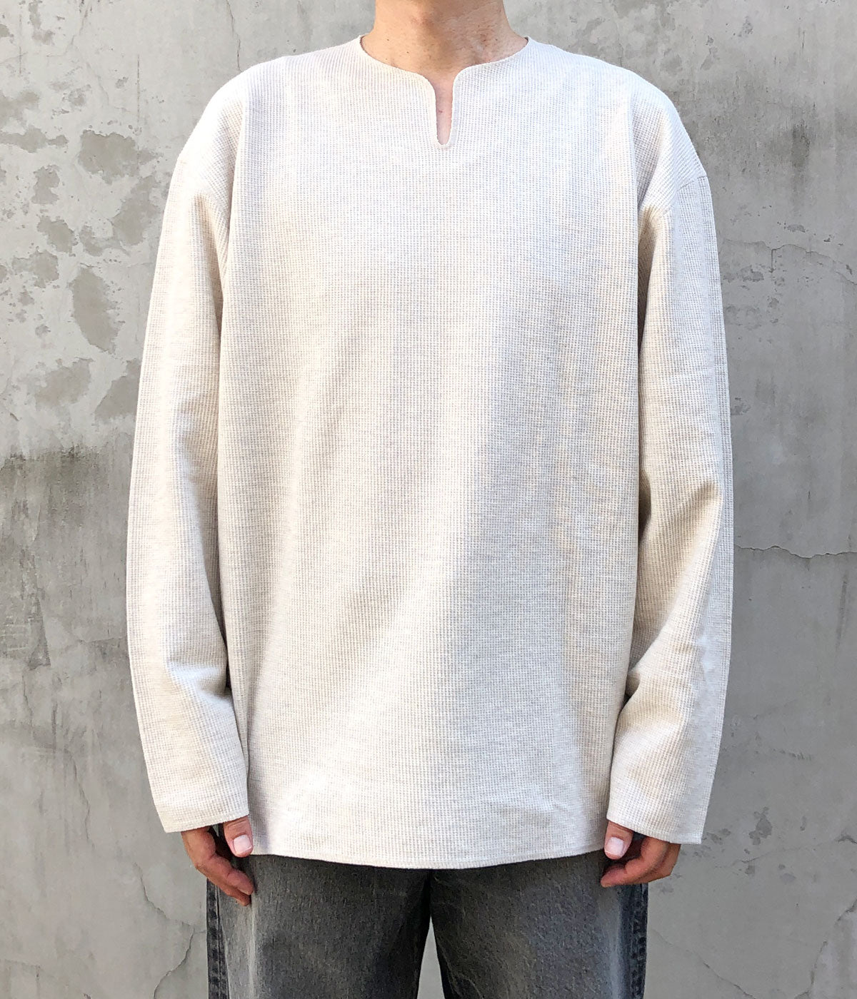 blurhms ROOTSTOCKから、ROUGH&SMOOTH THERMAL OVER NECK LSが入荷しました。表地は凹凸のある質感、裏地はフラットに仕上げたこだわりのワッフル生地を使用し、ネックの切込みや裾周りをオーバーロックで仕上げたラフな雰囲気をまとったLS。素材由来の光沢感のある表情と、洗いをかけたこなれた雰囲気がポイントです。
