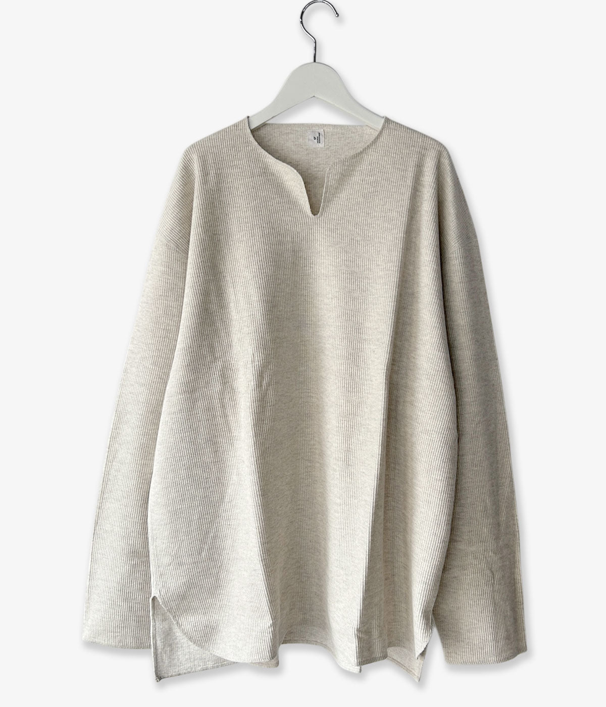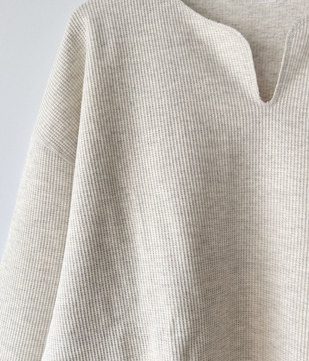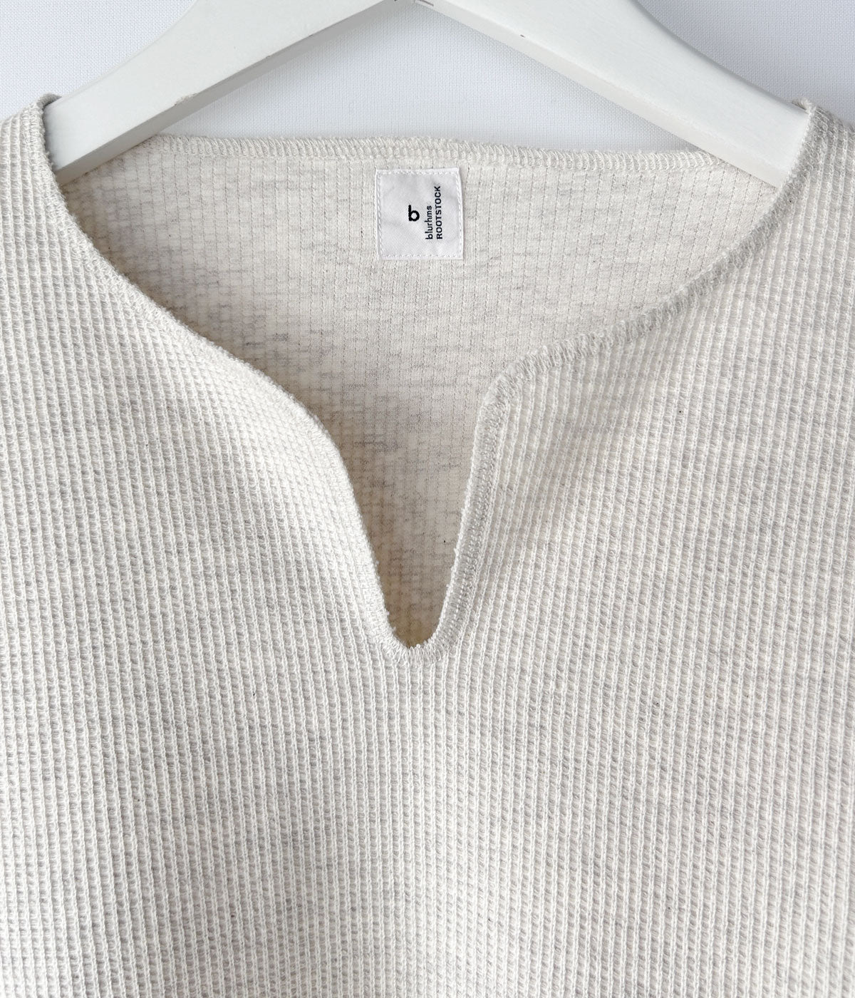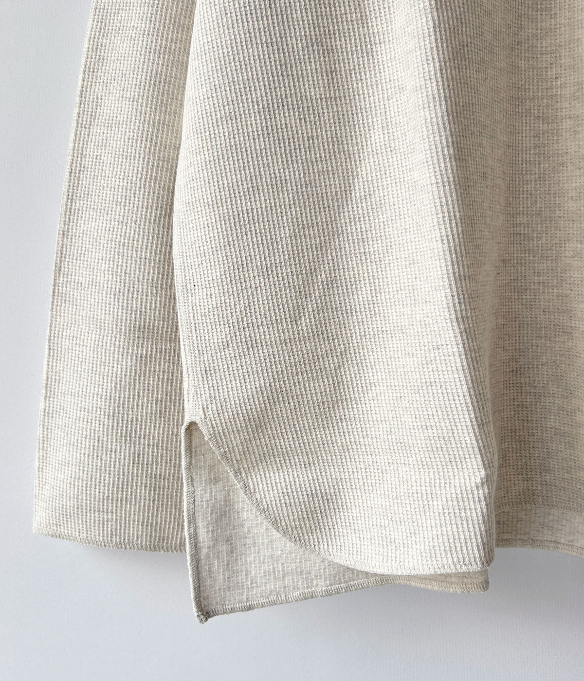 blurhms ROOTSTOCKから、ROUGH&SMOOTH THERMAL OVER NECK LSが入荷しました。表地は凹凸のある質感、裏地はフラットに仕上げたこだわりのワッフル生地を使用し、ネックの切込みや裾周りをオーバーロックで仕上げたラフな雰囲気をまとったLS。素材由来の光沢感のある表情と、洗いをかけたこなれた雰囲気がポイントです。