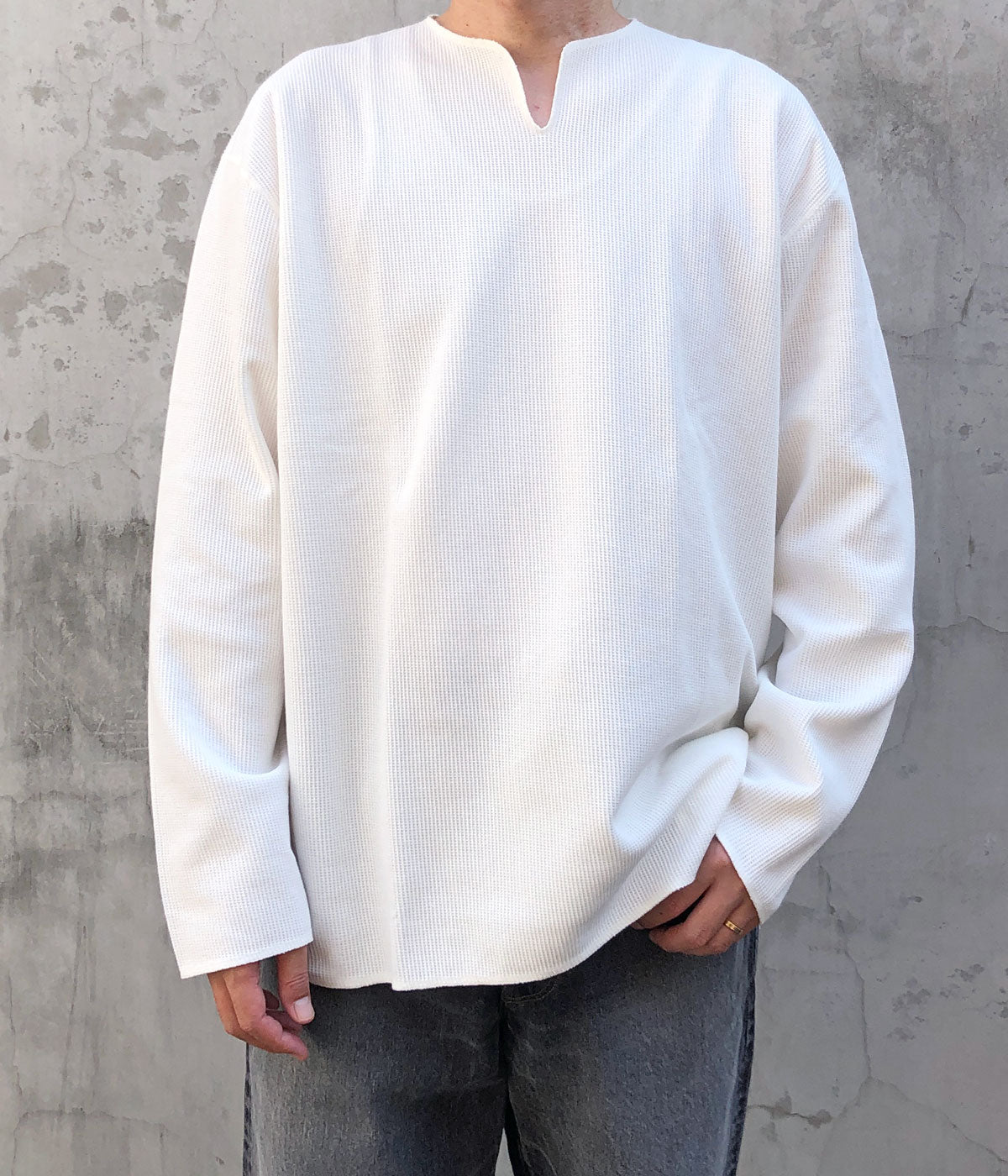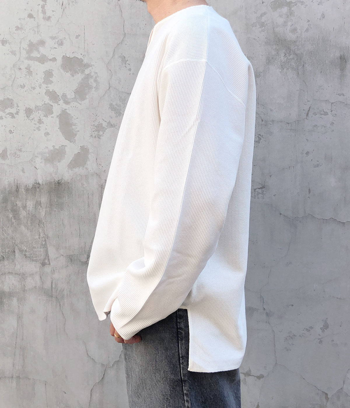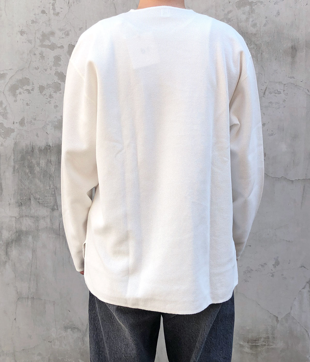 blurhms ROOTSTOCKから、ROUGH&SMOOTH THERMAL OVER NECK LSが入荷しました。表地は凹凸のある質感、裏地はフラットに仕上げたこだわりのワッフル生地を使用し、ネックの切込みや裾周りをオーバーロックで仕上げたラフな雰囲気をまとったLS。素材由来の光沢感のある表情と、洗いをかけたこなれた雰囲気がポイントです。