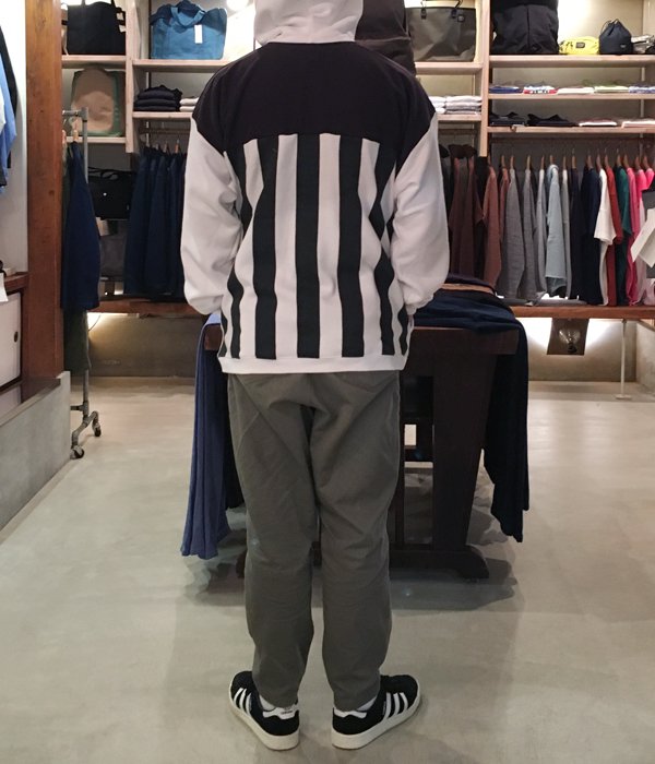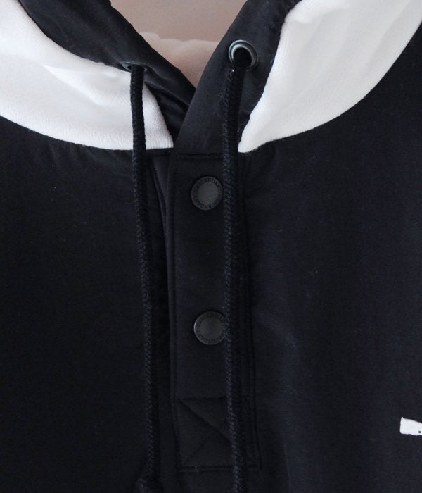 モノトーンで配色された裏起毛スウェットをベースにヨーク部分とフードの縁を黒無地のナイロンクロスで覆ったハーフプラケットのプルオーバーフーディ。肩を落としたゆったりとしたシルエットです。
