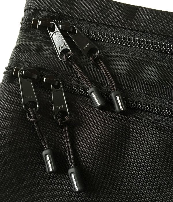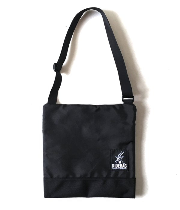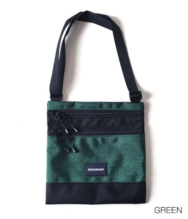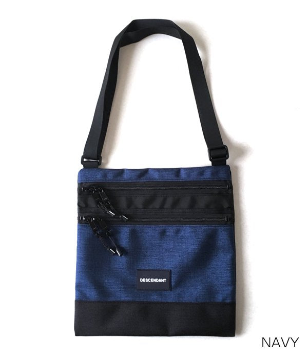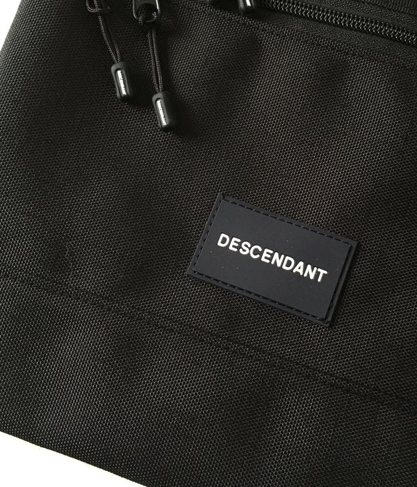 コーデュラナイロンを使用したRIDE BAG共同製作のサコッシュ。スクエアな形状のメインキャビンに重ねてファスナーポケットを設けた2層式デザイン。細いテープのショルダーストラップ。DESCENDANTのラバーパッチとRIDE BAGの織りネーム付き。
