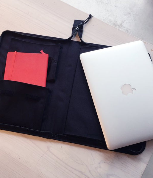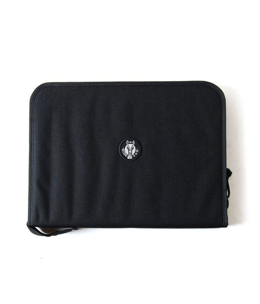DESCENDANTが新たにRIDE BAGに別注した三方ファスナー開きのブリーフケース。フラップポケット付きのインナーに書類やステーショナリーはもちろん、モバイル端末とバッテリーの収納にも対応する。
