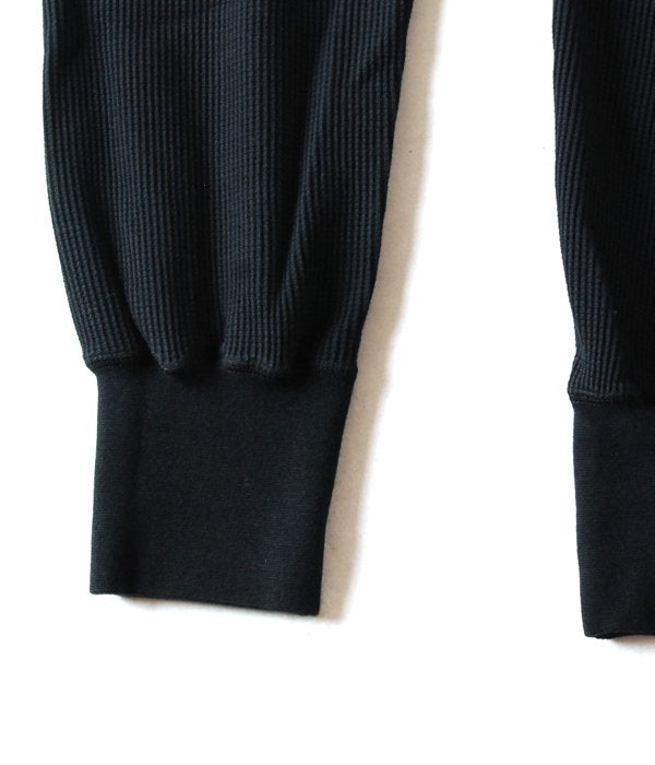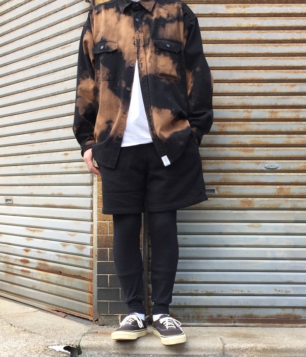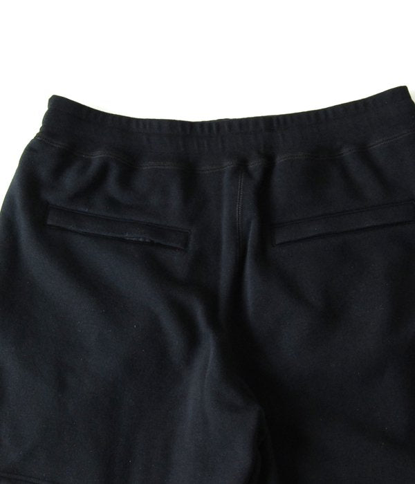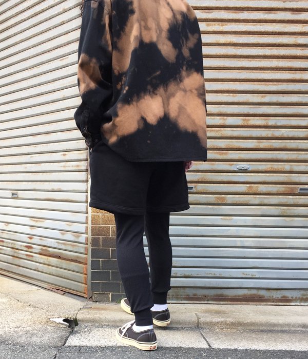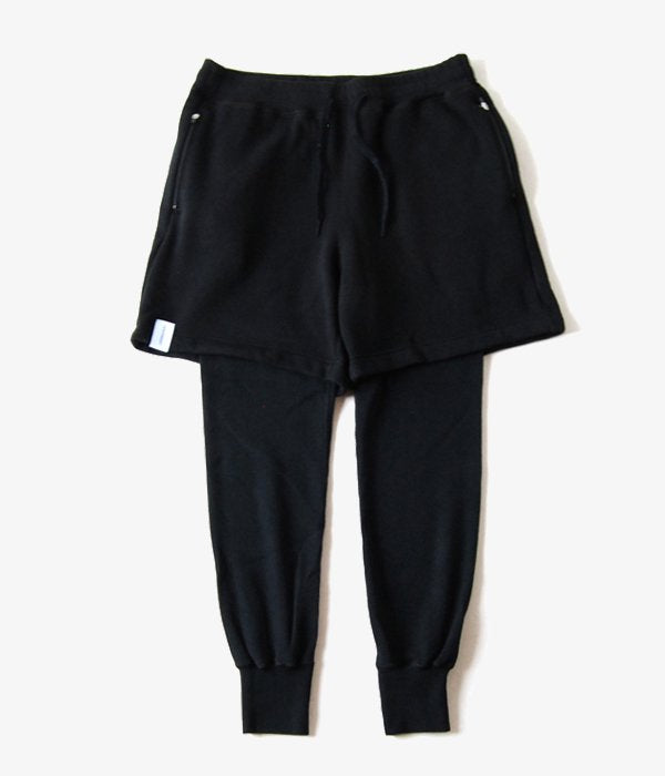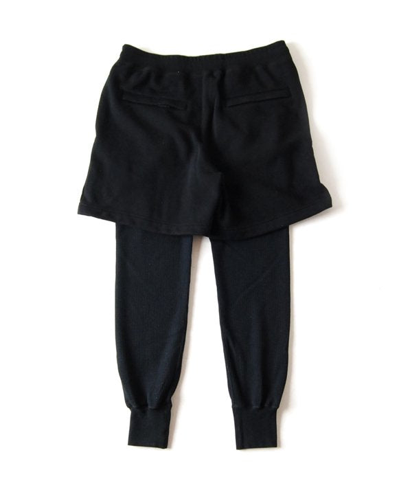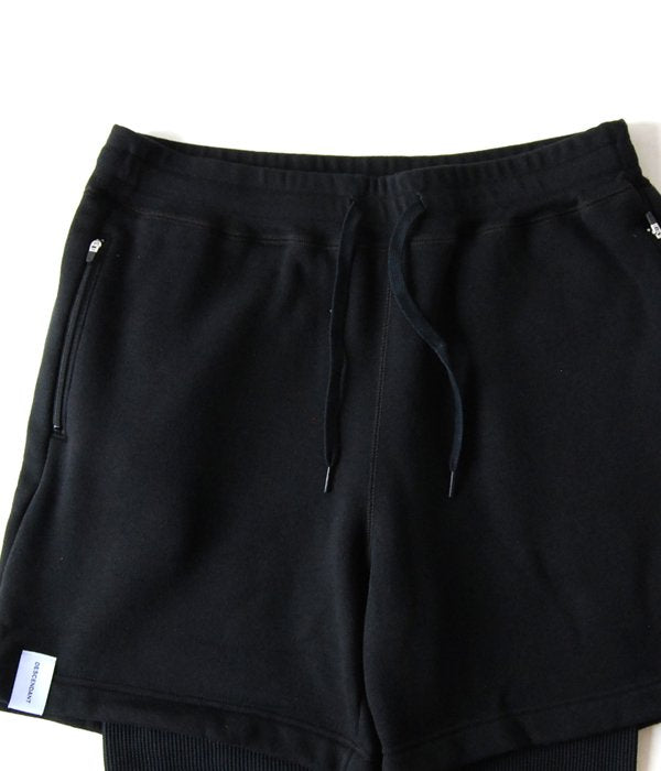 コットン・ポリエステル混紡の裏起毛ジャージーを使用したスウェットショーツにサーマル地のレギンスを切り替えたレイヤード仕様。