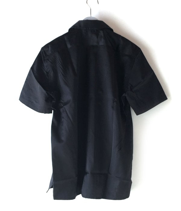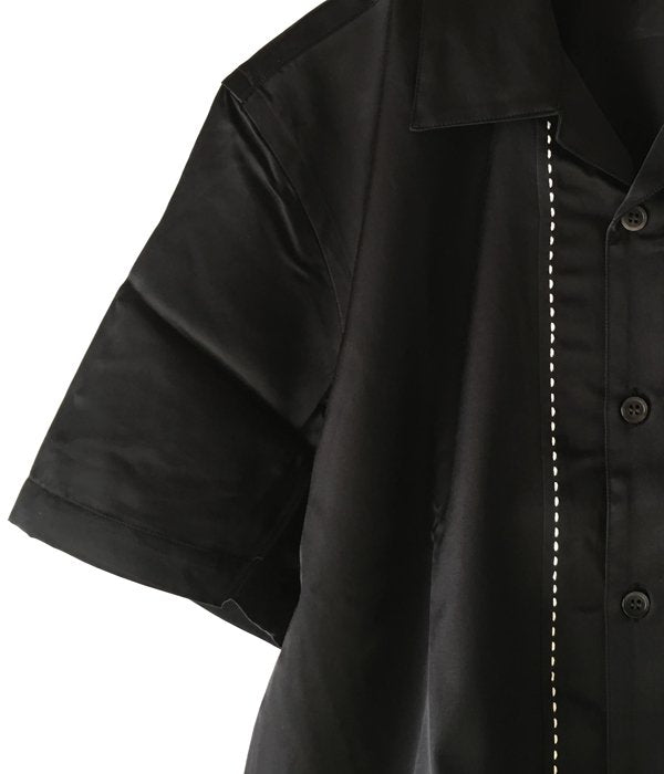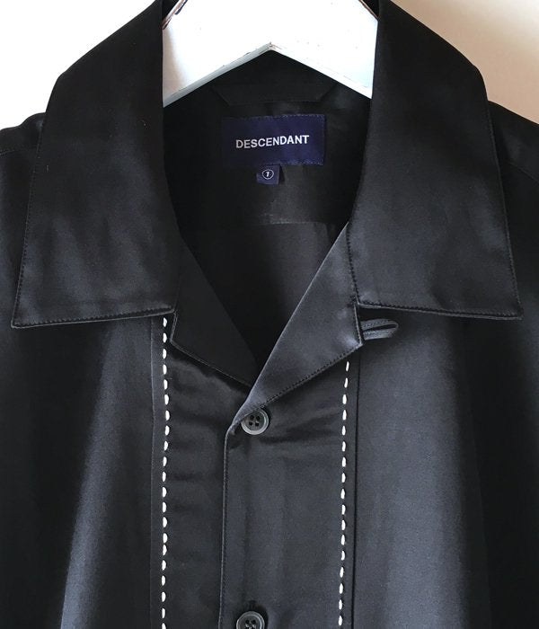 レーヨン/コットン交織の光沢感のあるサテン生地を使用したオープンカラーシャツ。前立ての左右を共地で切り替え、白糸のステッチをアクセントに。サイドスリット入りのボックスシルエット。