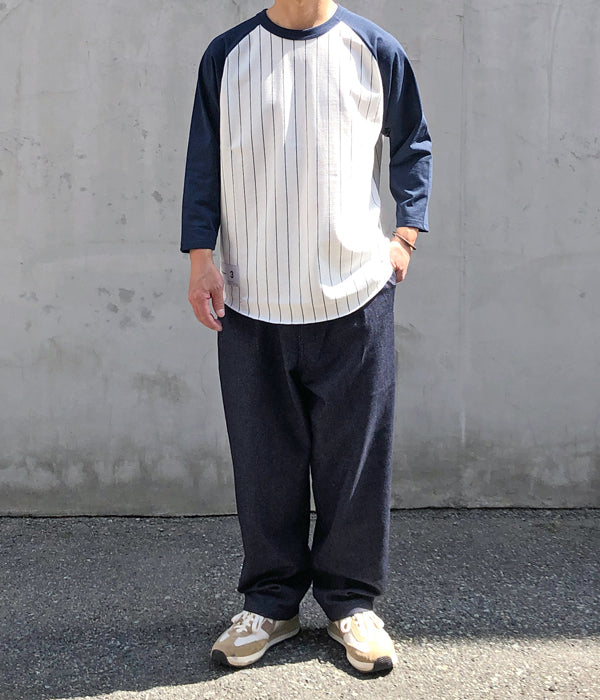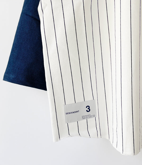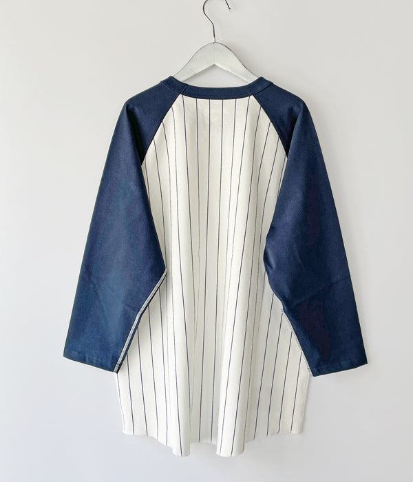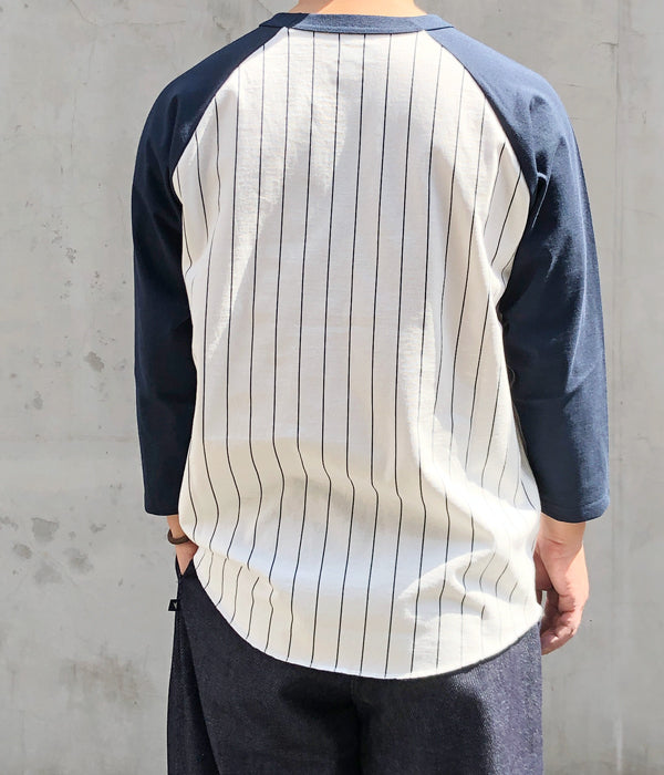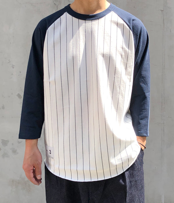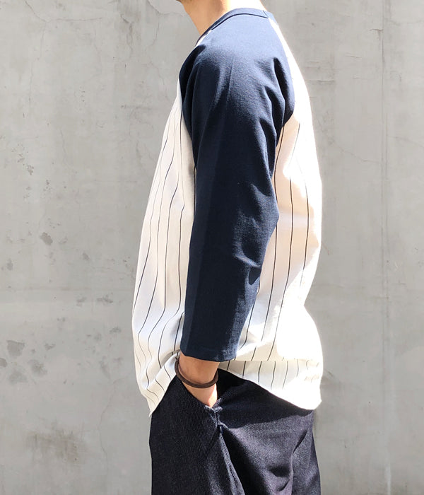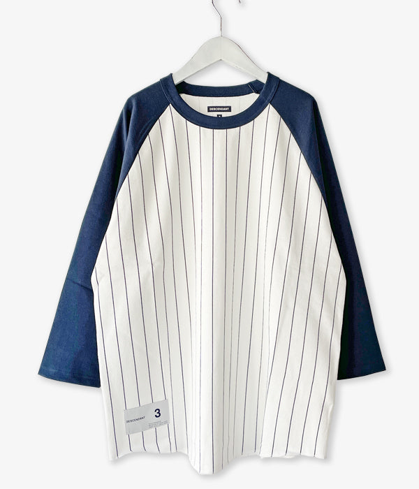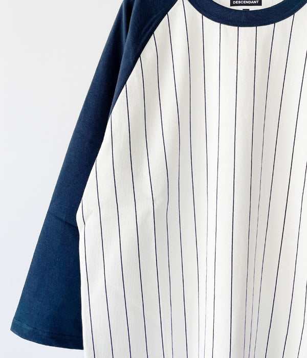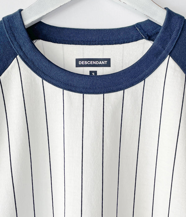 DESCENDANTから、E.P LSが入荷しました。コットンジャージー製のピンストライプ柄ベースボールTシャツ。袖をネイビーに切り替えたツートーンカラーのラグランスリーブ仕立て。ラウンドしたヘムライン、裾のサイズ表記織りネームがアクセントに。