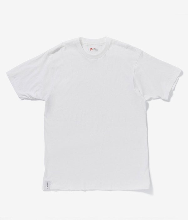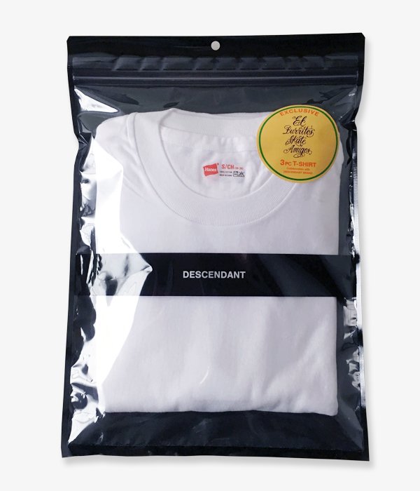 HANESボディのブランクボディにEL BURRITO'Sのボックスロゴをバックプリント、前身頃の右裾にDESCENDANTのピスネームを縫い付けたパックTシャツ。3枚組。