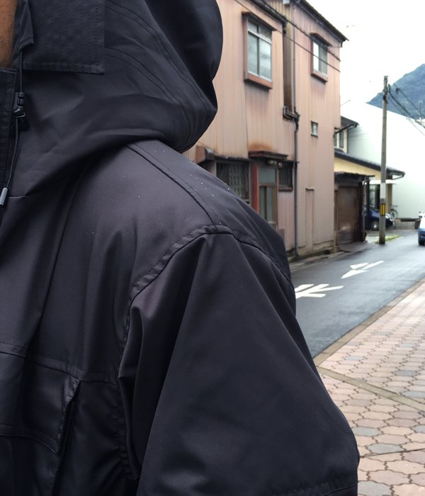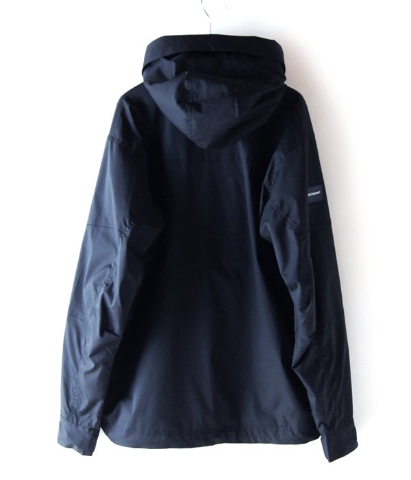 ストレッチの利いたツイル地を直線的に切り替えたシェルジャケット。頭をスッポリ覆うフードのバイザーをステッチで補強。鋭角的なバストポケットに加えて、左袖にジップポケット付き。